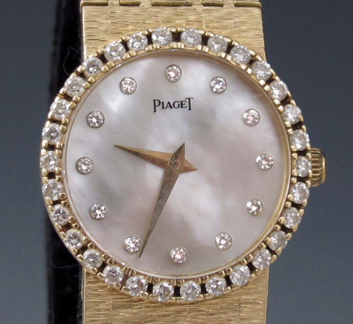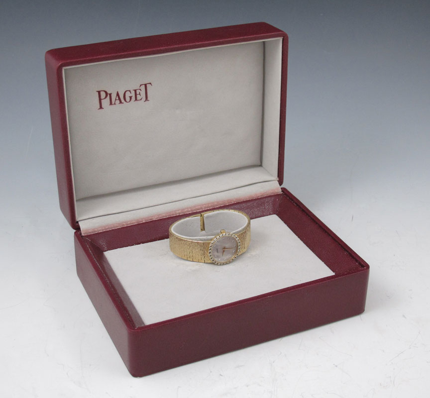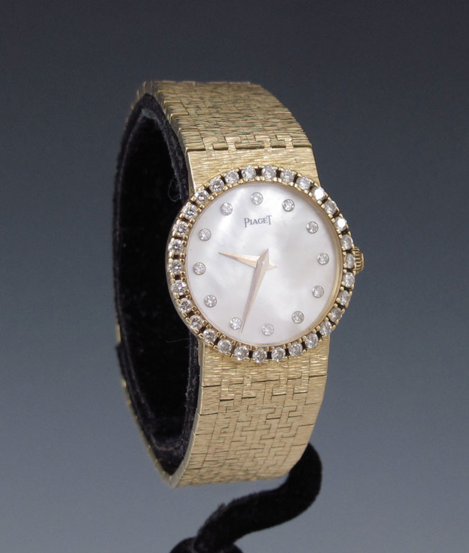 18K PIAGET LADIES WRISTWATCH: Mother of pearl dial with diamond markers. Triple signed on the dial, case, and movement. Quartz movement in running order. Shows that the watch has been worn. Diamond weight approx. .75 Ct. Gross weight 59.8 grams. Length 6''. Sold in the presentation box, leaflet included.