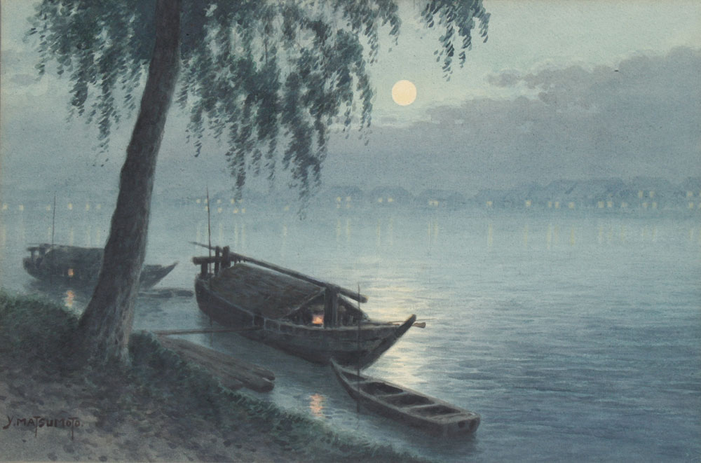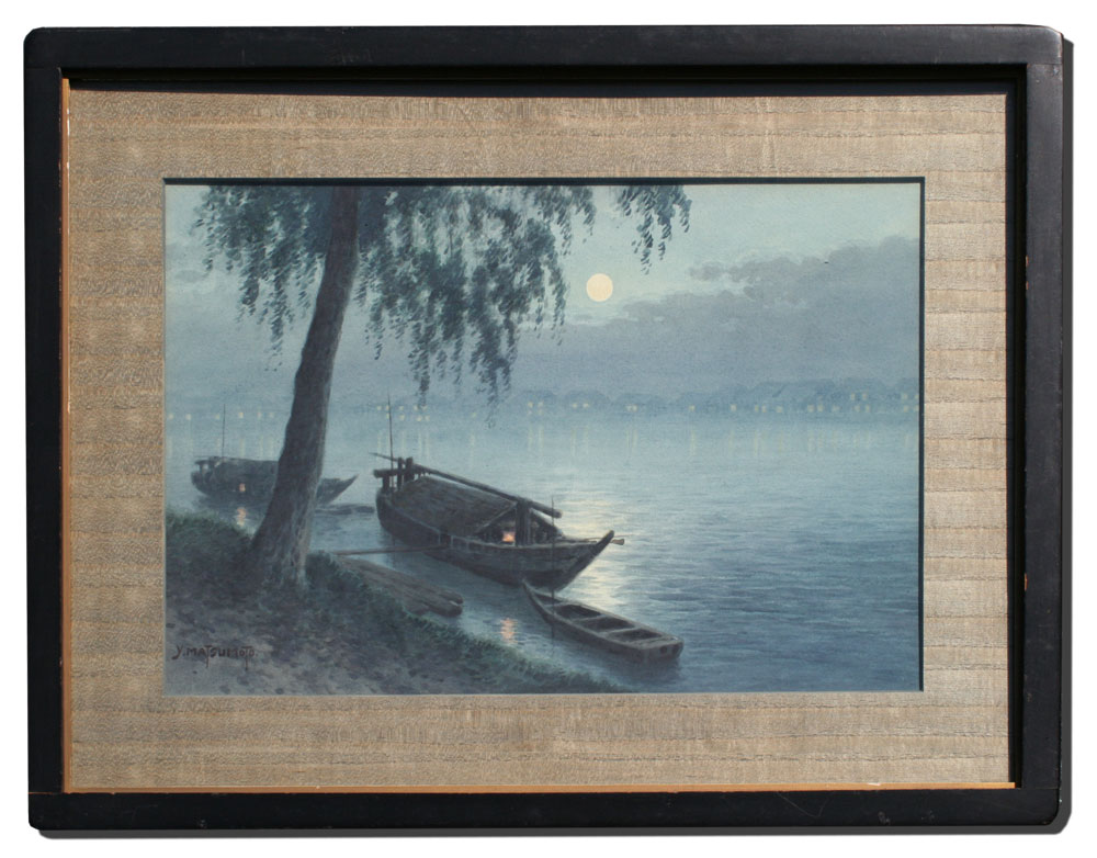 MATSUMOTO, Y. (Japanese, 20th C.): ''Moonlight Night on the River'', Watercolor, sight size 12 1/2'' x 18 3/4'', signed lower left, period frame with wear, 19 1/2'' x 26''.