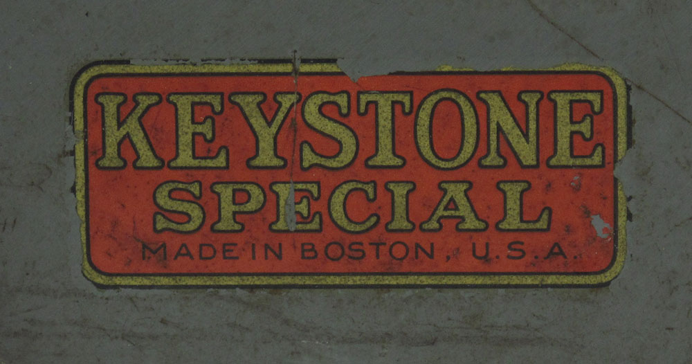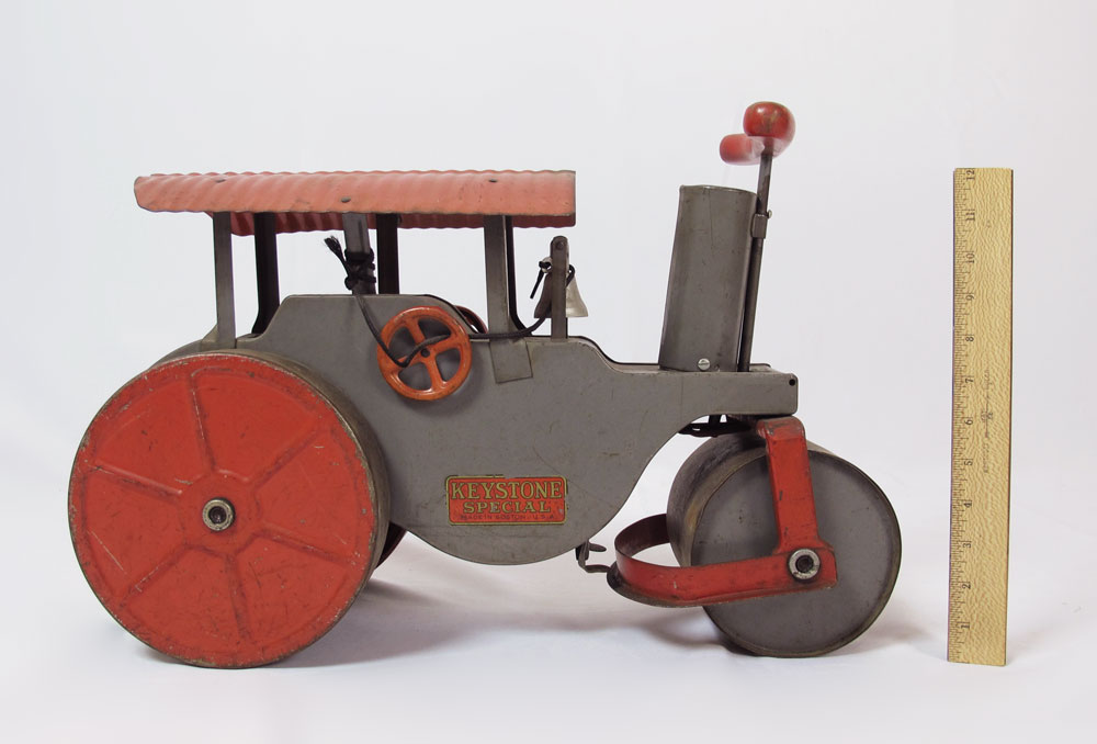 KEYSTONE SPECIAL PRESSED STEAM ROLLER 60: Circa late 1920's - 1930's, original grey paint and original decal. Red corrugated roof. Steers by front handle. Measures 12'' h. x 20 1/2'' x 8 1/2''