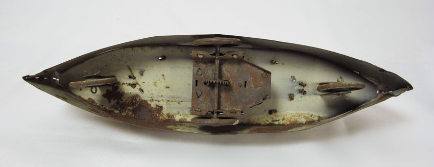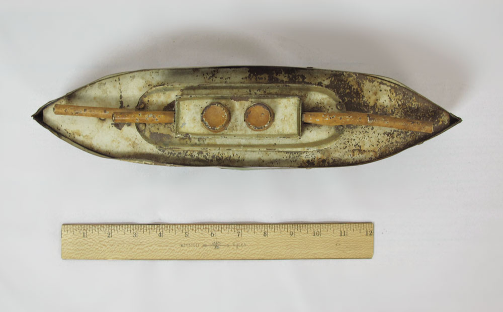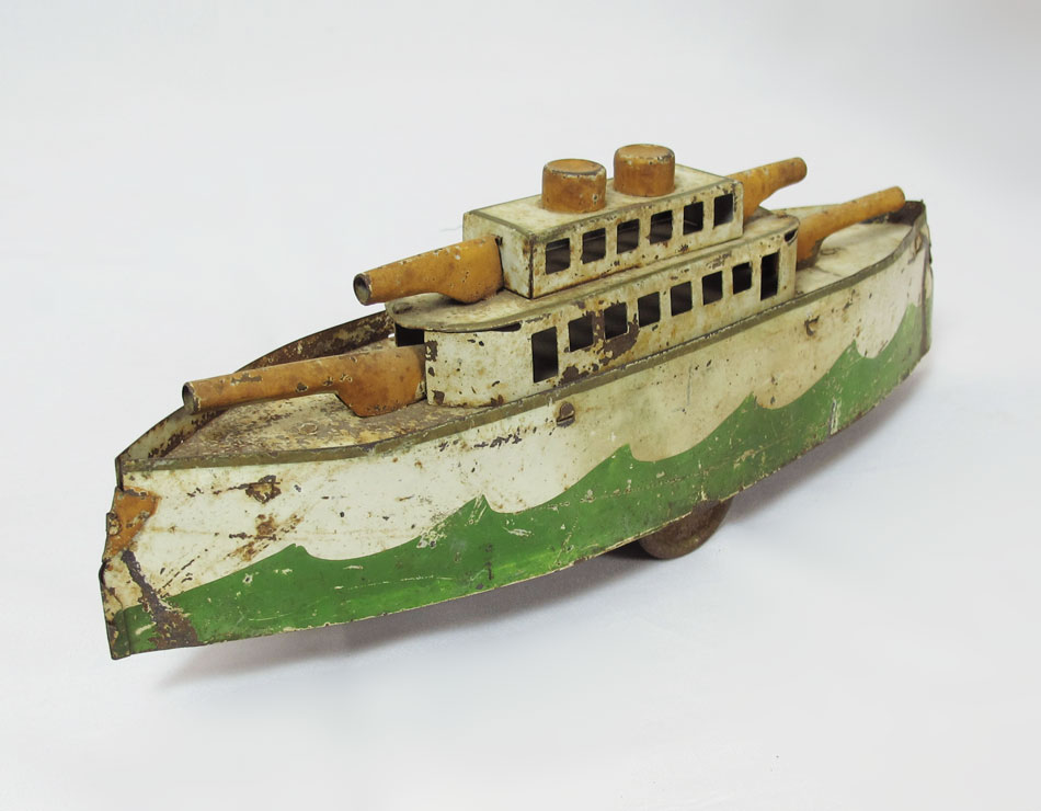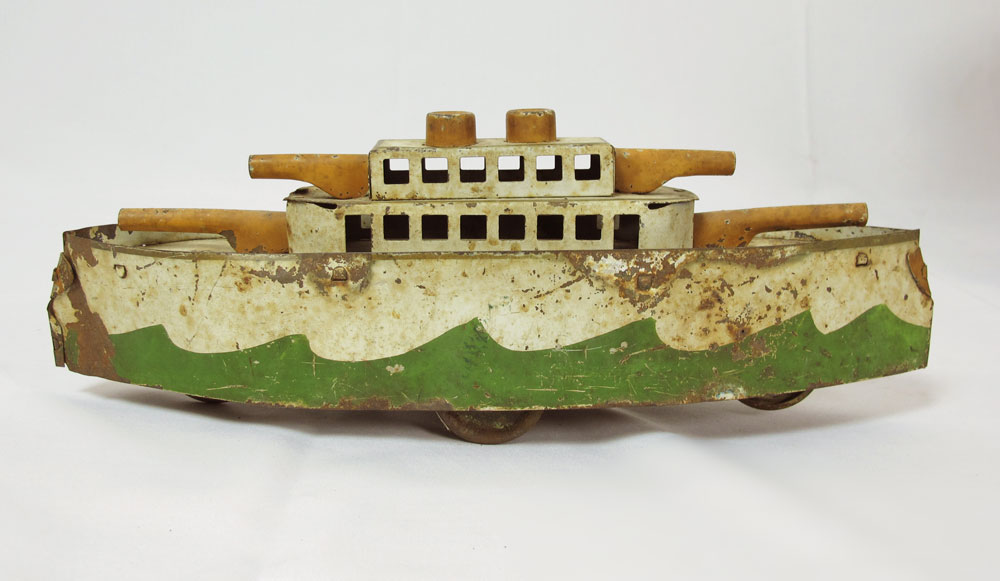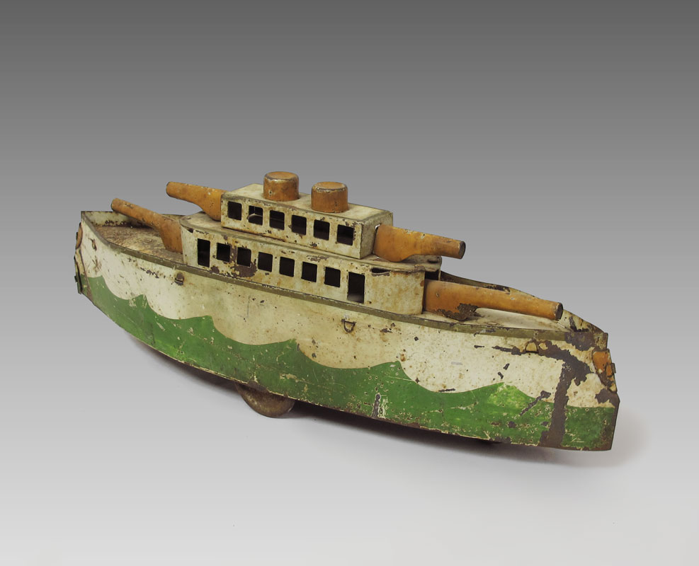 DAYTON PRESSED STEEL BATTLESHIP: Friction drive with original paint and guns. Cream over green water ling, orange guns, steamers and accents. Solid wheels. 5 1/8'' h. x 15'' x 3 1/2''.