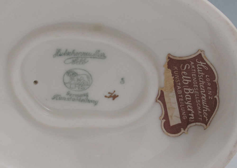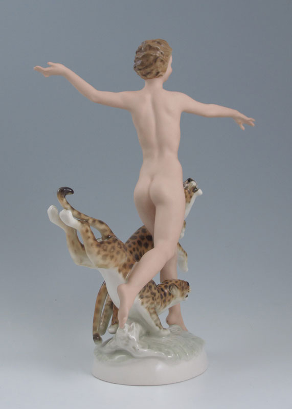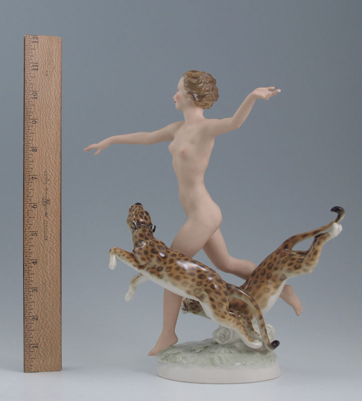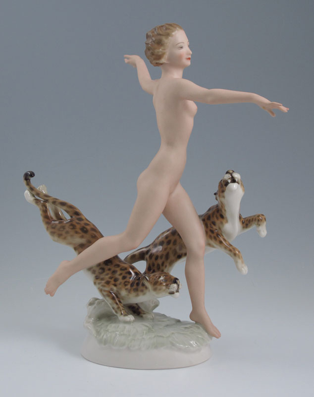 HUTSCHENREUTHER PORCELAIN NUDE FIGURE WITH LEOPARDS: Art Deco figurine depicting nude prancing with two leopards, approx. 11'' tall, her arms spread 8 1/2'' wide. Paper label and backstamp under glaze.