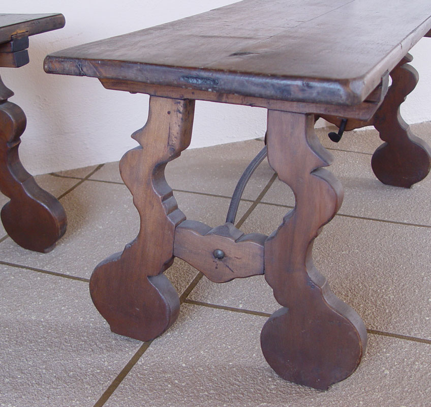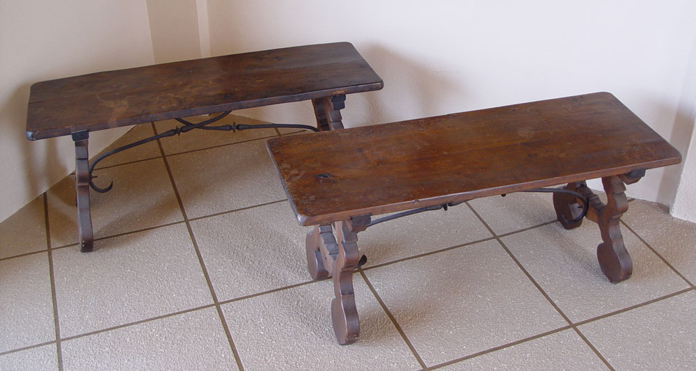 PAIR OF CUSTOM SPANISH STYLE BENCHES WITH IRON SUPPORTS: Plank board top with open shaped legs. Hand crafted iron leg supports. 43 1/2'' h. x 30 1/2'' x 17''.
