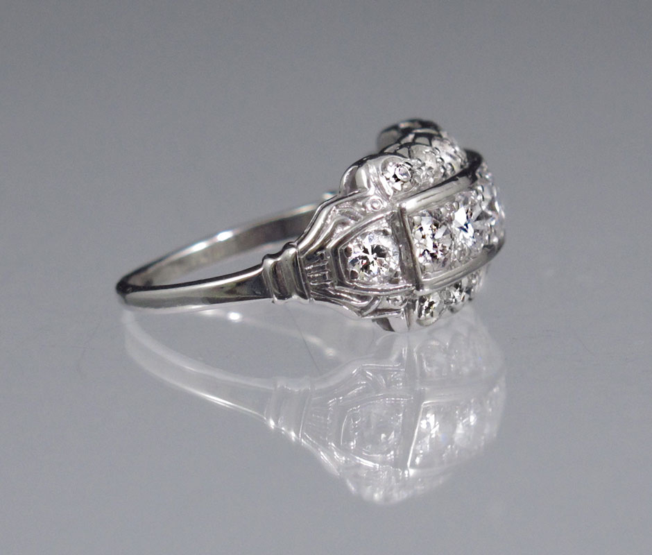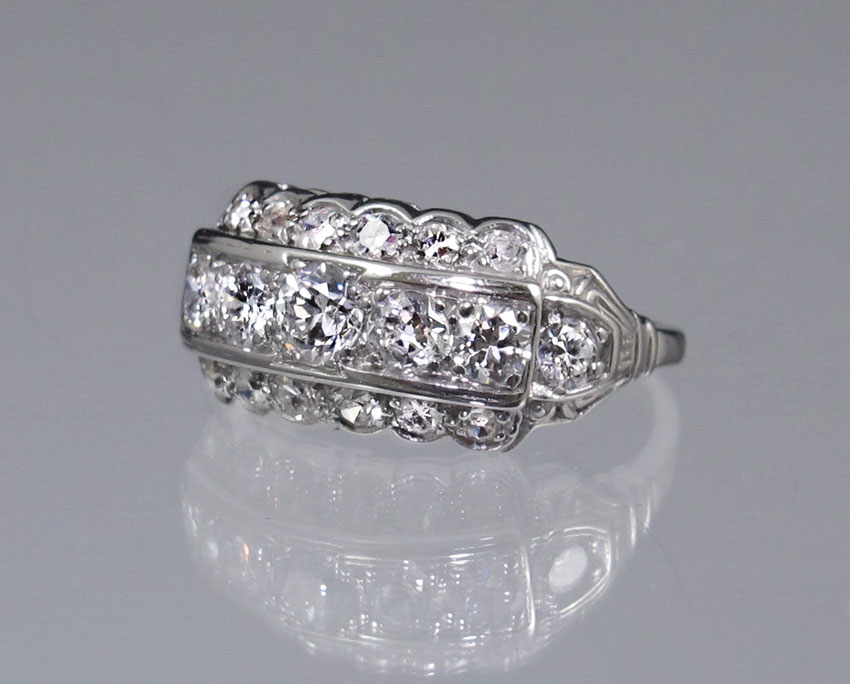 PLATINUM THREE ROW DIAMOND RING: Platinum retro Deco ring contains 19 round brilliant cut and single cut diamonds. Weight: 1.50 Ct. Approx. The diamonds average VS in clarity and G-H in color. The diamonds are bead set. Weight: 4.4 grams. Size: 5.5, Signed: Jabel