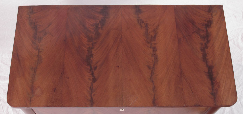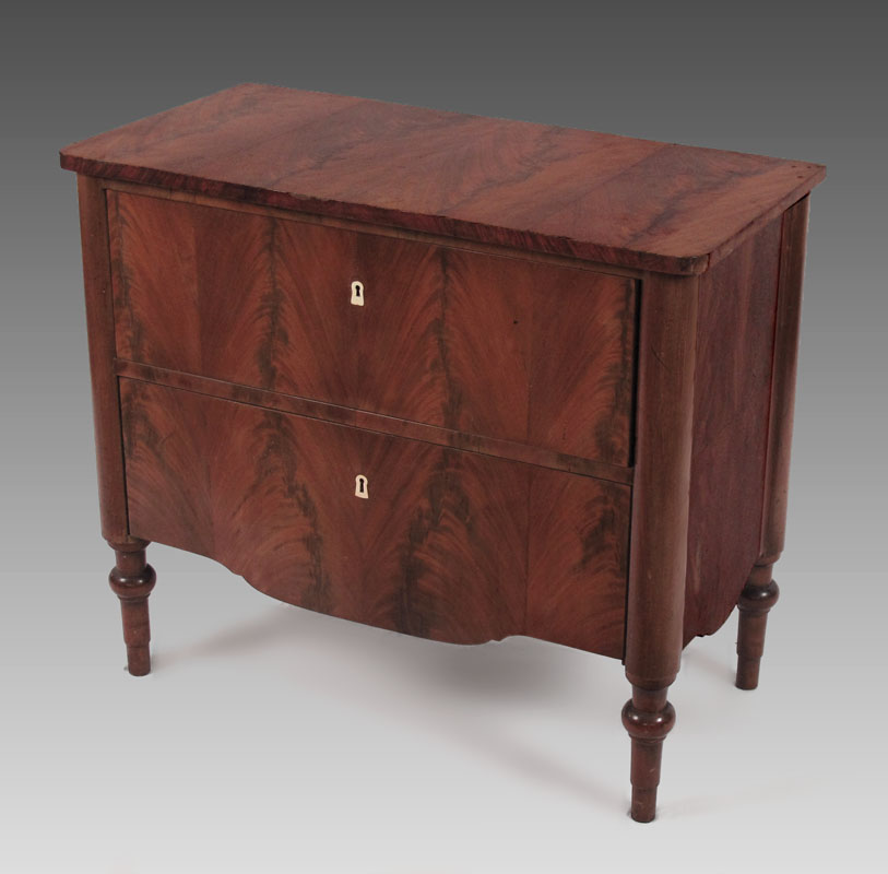20th C CONTINENTAL 2 DRAWER CHEST: Very pretty flame grain veneer to top and drawer fronts, bone escutcheons, shaped bottom drawer, raised on turned legs, with key. 29 1/2''h. x 34 1/4''w. x 17 3/8''d.