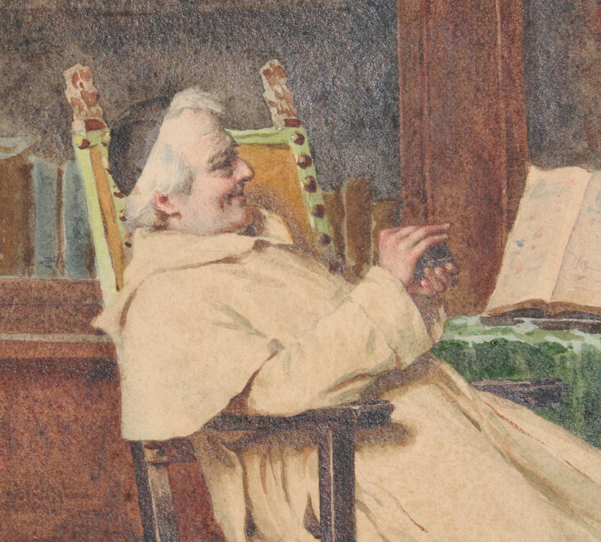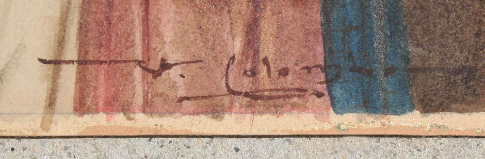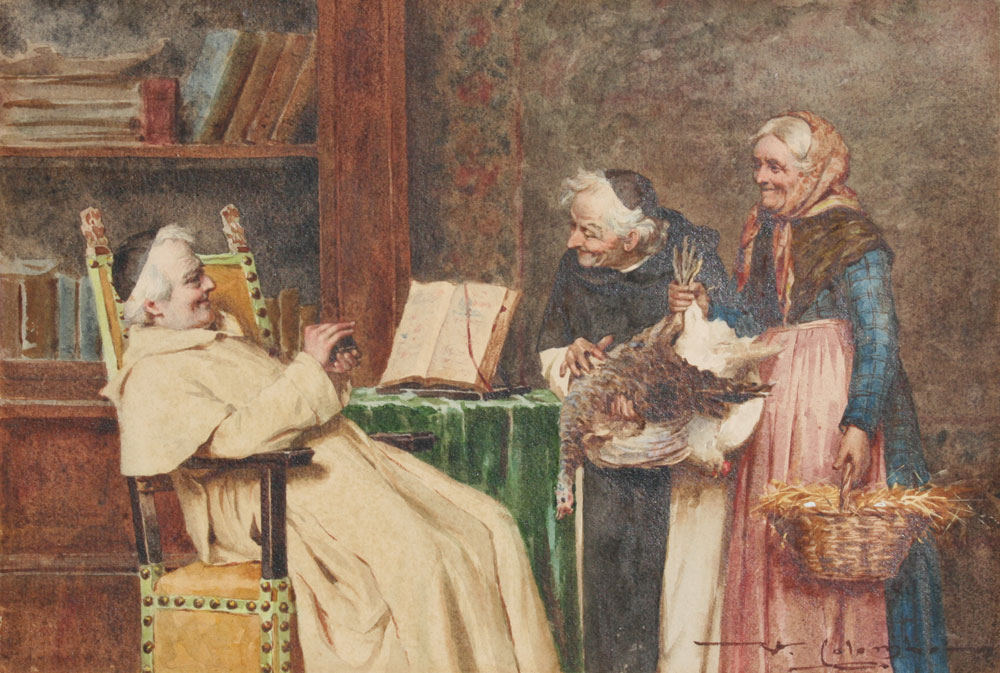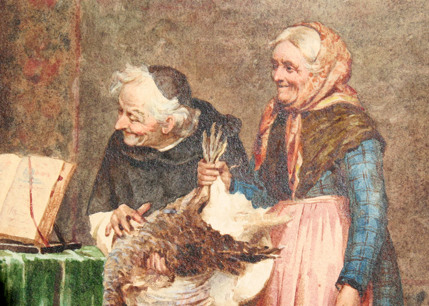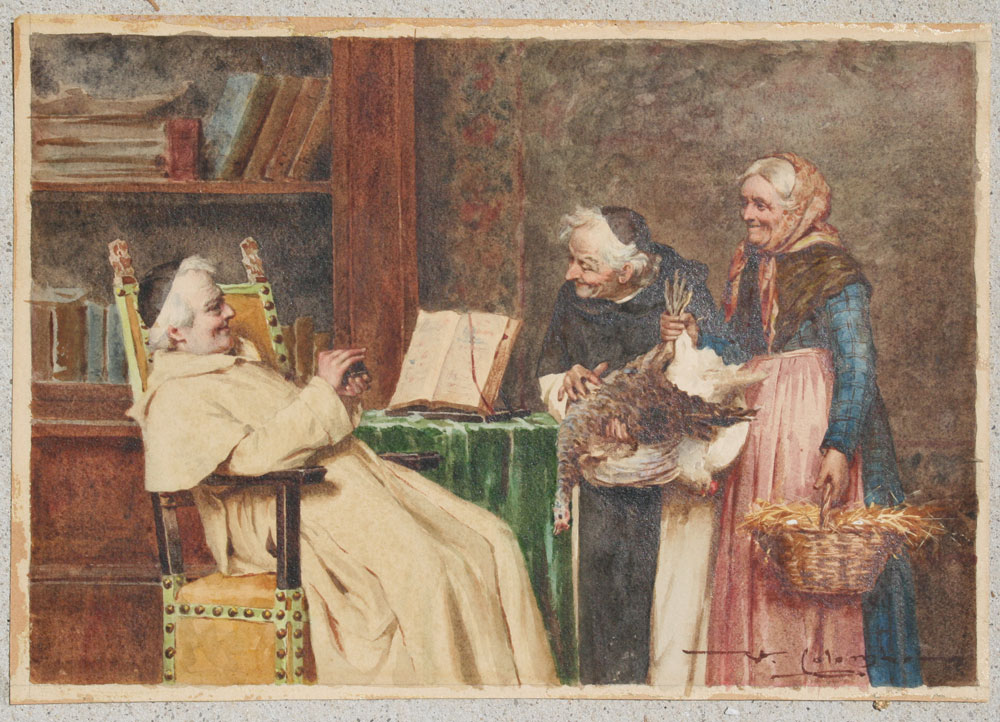 COLOMBO, Virgilio, (Italian, 19th C.): Elderly Couple Bearing Gifts of Poultry, Watercolor, 7 1/4'' x 10 1/2'', contemporary frame, 11'' x 15''.