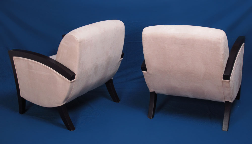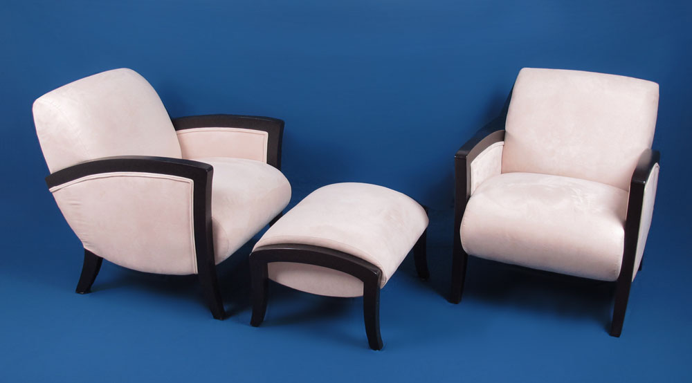 ULTRA MODERN ULTRA SUEDE EASY CHAIRS AND OTTOMAN: Tan with black wood supports. Chairs 33 1/2'' x 28 3/4'' x 35'', ottoman 17'' h. x 27'' x 21''.