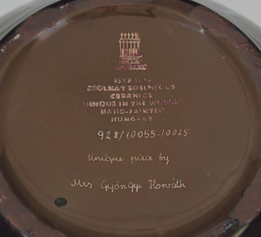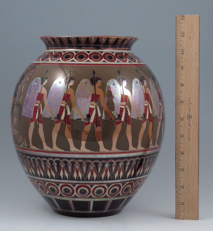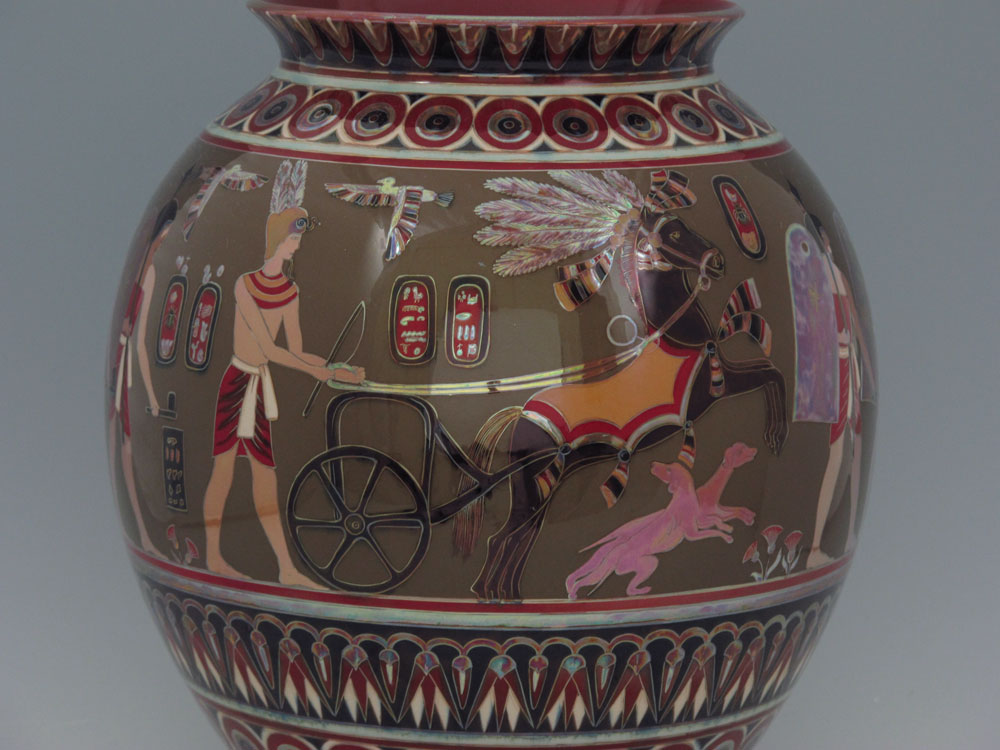 LARGE ZSOLNAY EGYPTIAN DECORATED CERAMIC VASE: Stamped on bottom ''Zsolnay Eosineous Ceramics Unique in the World Hand Painted Hungary 928/10055-10025 Unique piece by Mrs. ***** Horvath''. 11'' tall, 9'' dia.