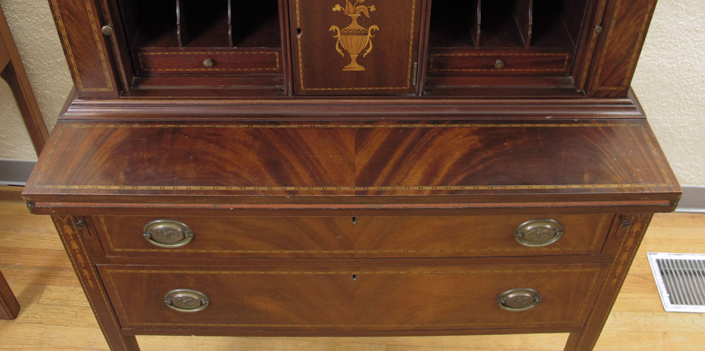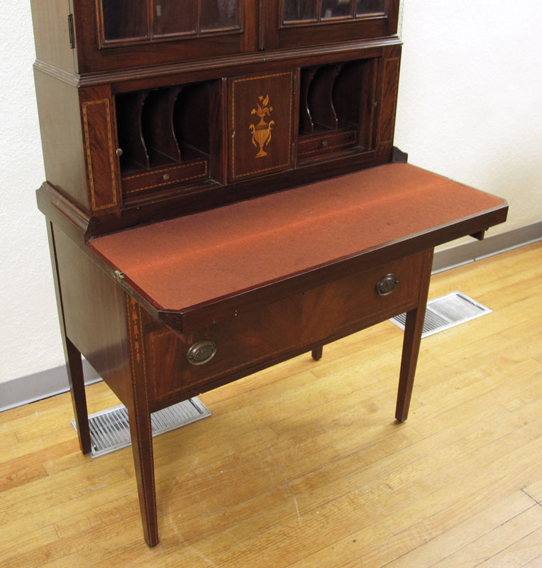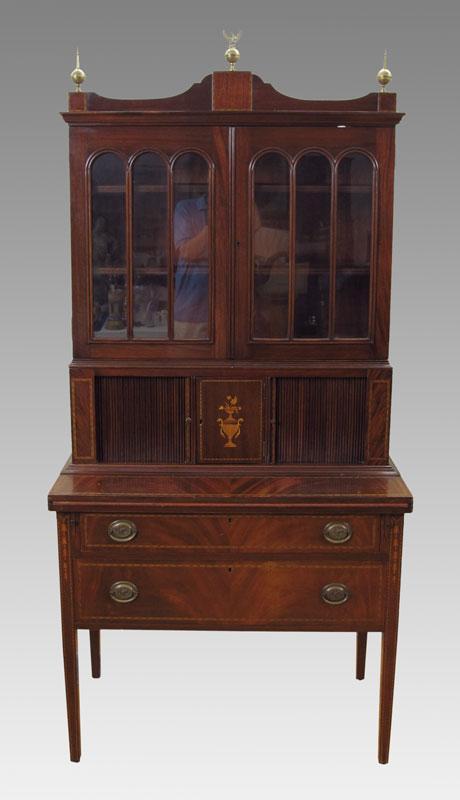 FEDERAL STYLE MAHOGANY TAMBOUR WRITING DESK BOOKCASE: Glass front bookcase over the tambour door secretary desk with interior cubicles and marquetry inlay door. The flip top writing surface with parquetry banding. Two full length drawers. Approx. 73'' x 36'' x 17 1/2''.