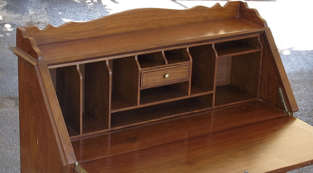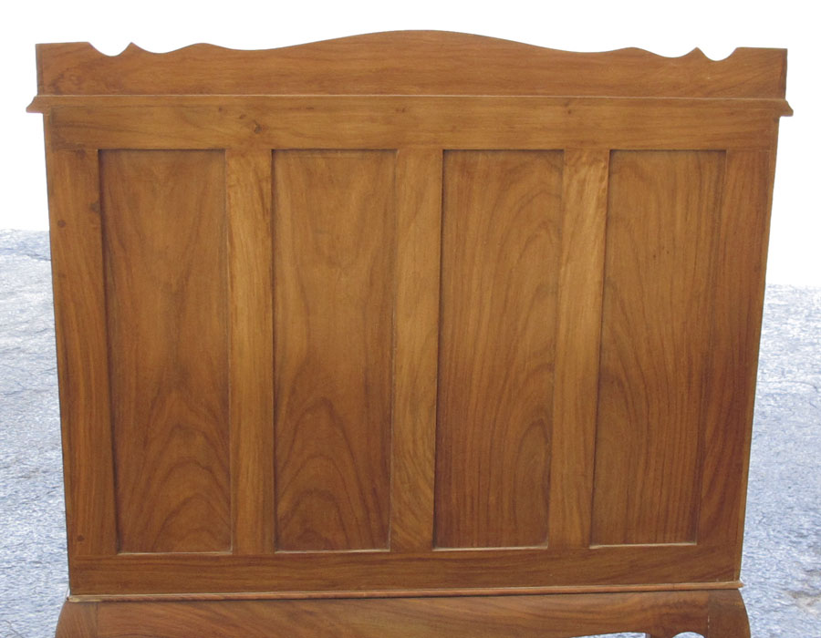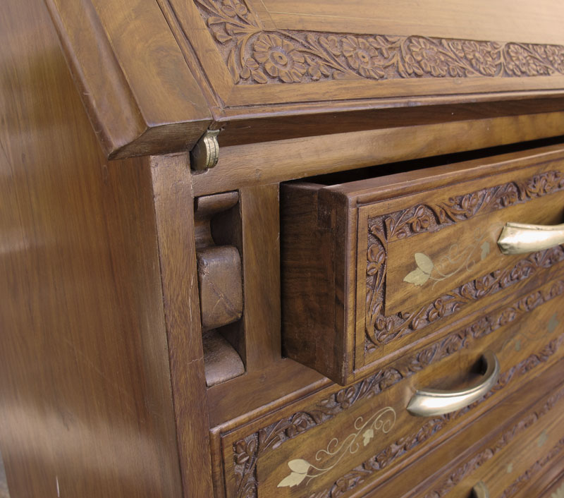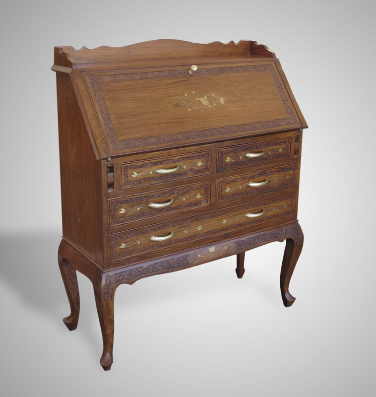 TEAK BOULLE INLAY SLANT FRONT DESK: Carved floral design with floral boulle inlay. Slant front top with pigeon holes and single drawer over 4 half and single full length drawer on 4 shaped legs. 43 1/4'' h. x 36 1/4'' x 14 1/4''. Sold with small hinged wood box in complimentary motif, floral carved corners and boulle inlay, 2 3/8''h. x 6 1/2'' x 4 1/2''.