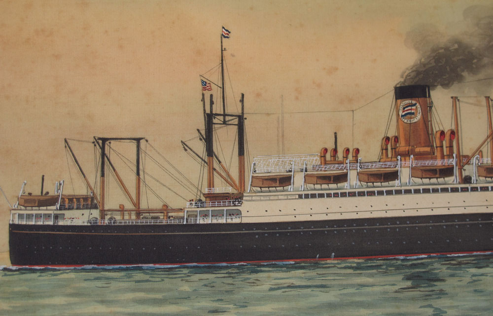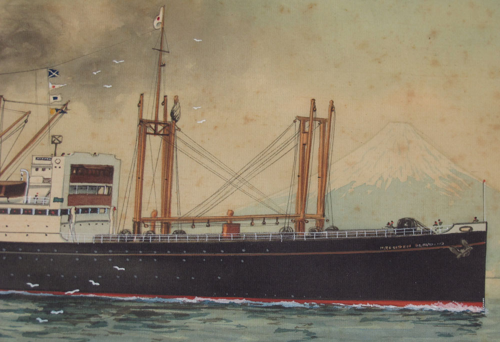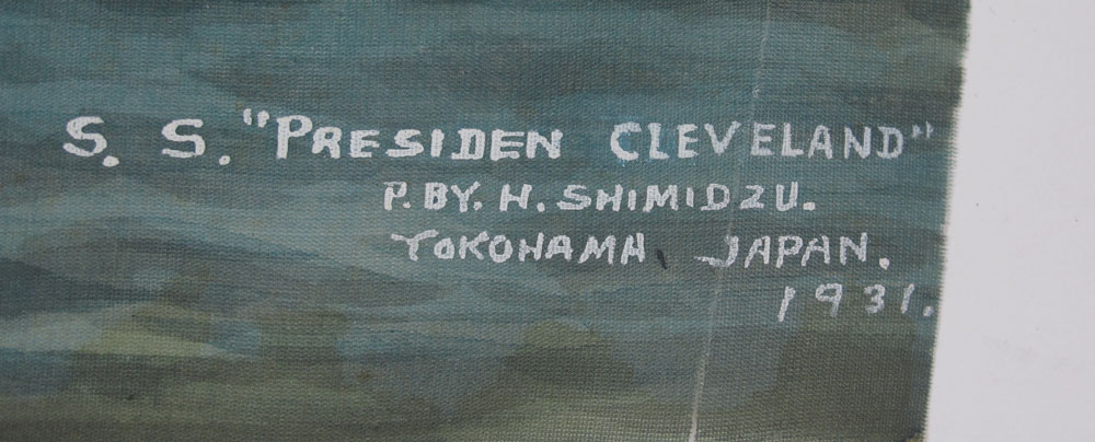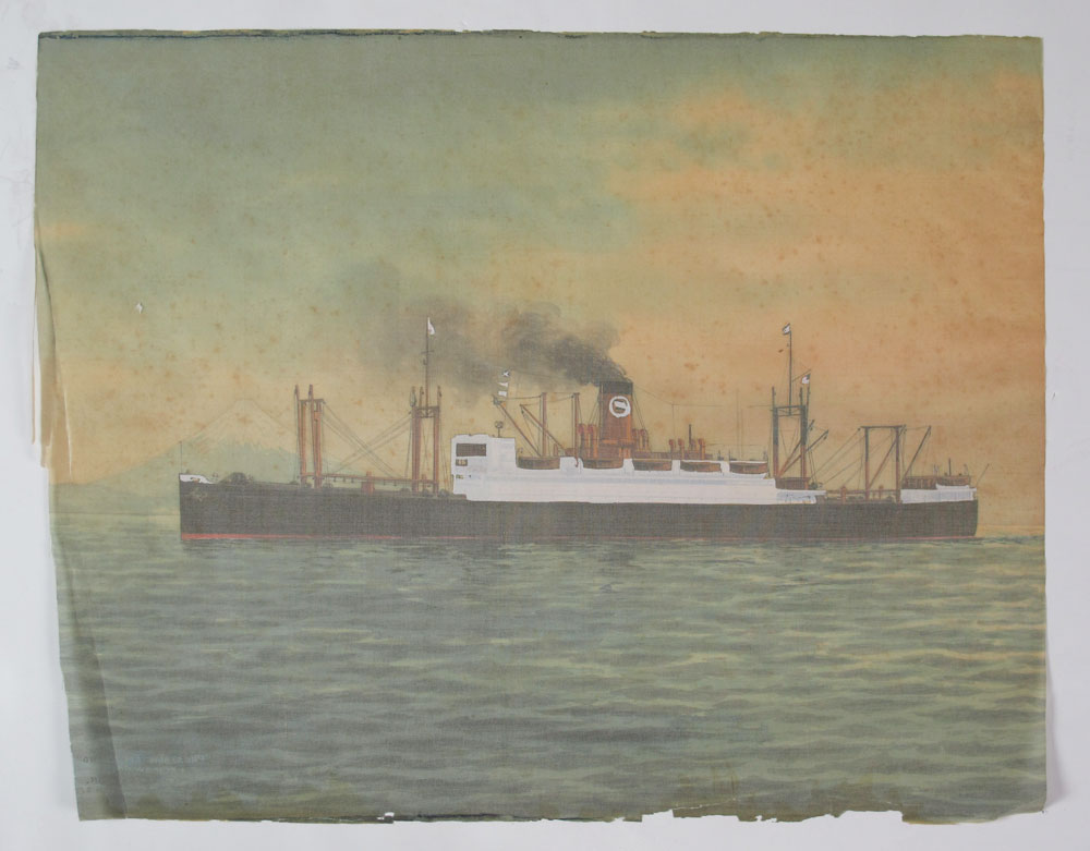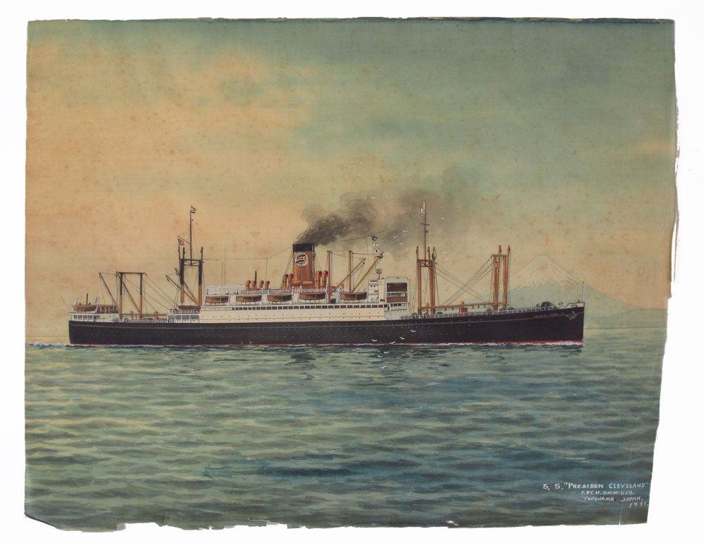 SHIMIDZU, H: ''SS President Cleveland Yokahoma, Japan 1931'', depicting SS President Cleveland with Mt. Fuji in the distance, Watercolor on Silk, sight size 14'' x 18'', unframed.