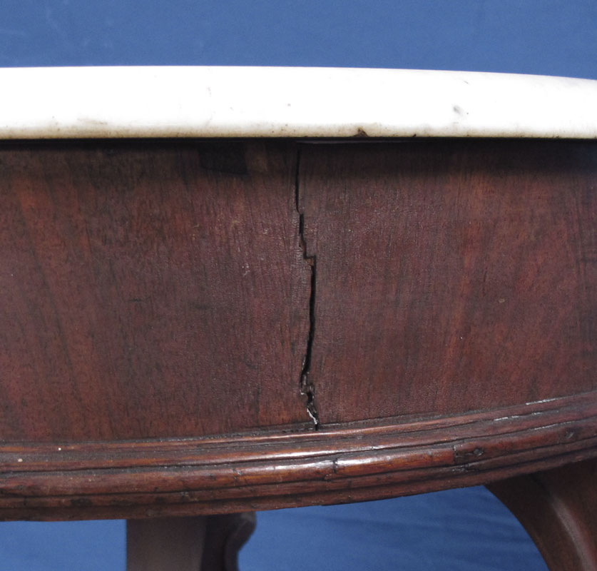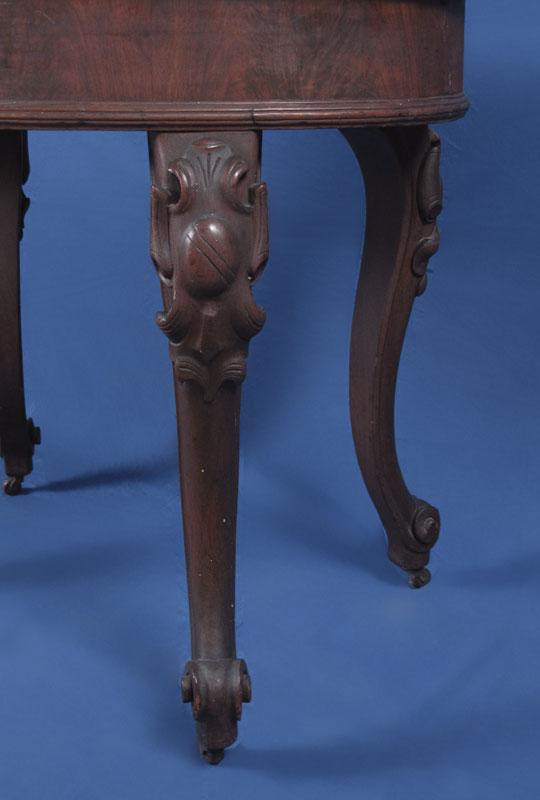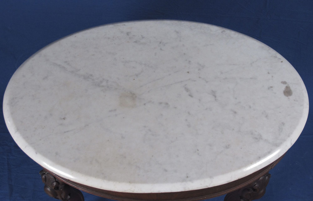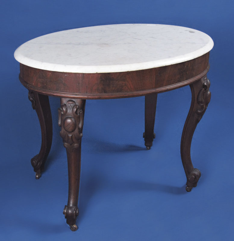 MARBLE TOP VICTORIAN PARLOR TABLE: White variegated marble top with polished edge. Mahogany veneered band over walnut frame with carved legs on castors. 29 3/4'' x 24'' x 37''.