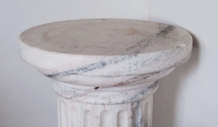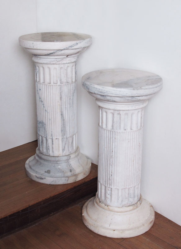 PAIR OF LARGE MARBLE COLUMNS: White variegated marble, separated in 3 sections. 39 3/8'' h. x 20''.