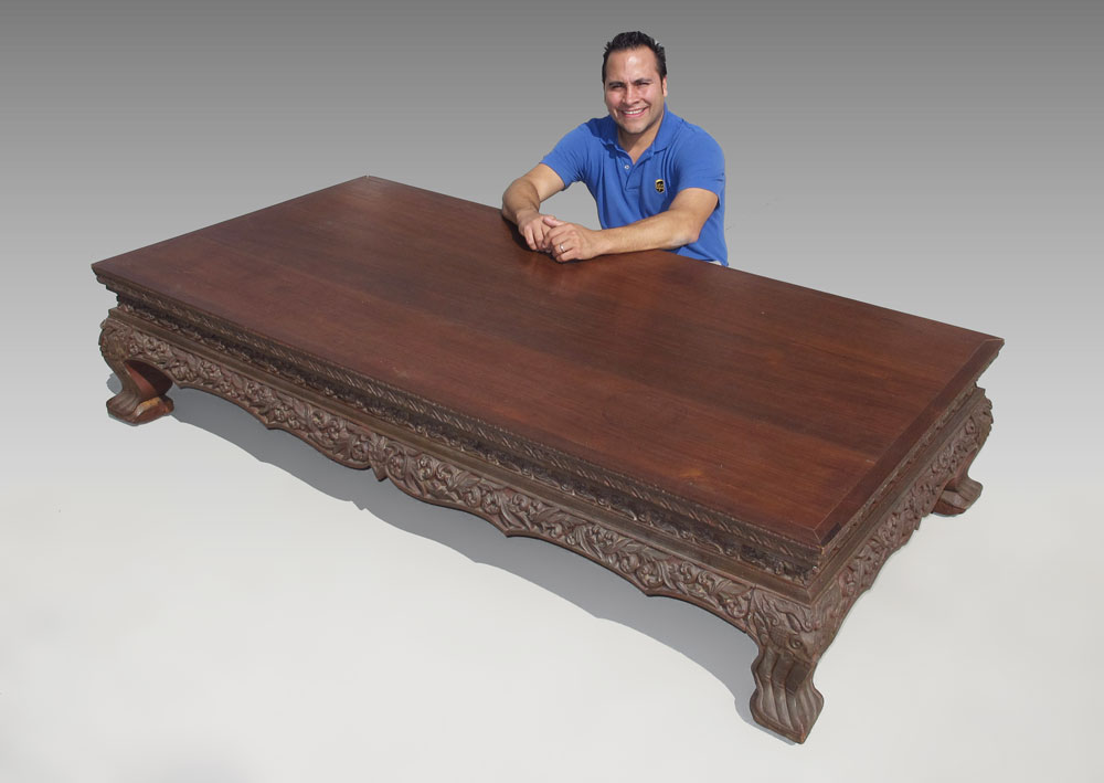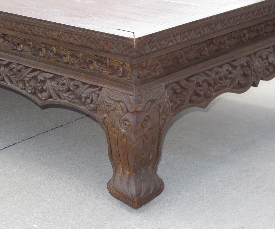 LARGE TEAK CARVED TABLE: Carved foliate scroll base with framed 3 board top. 16'' h. x 72 1/2'' x 36''.
