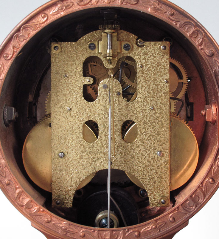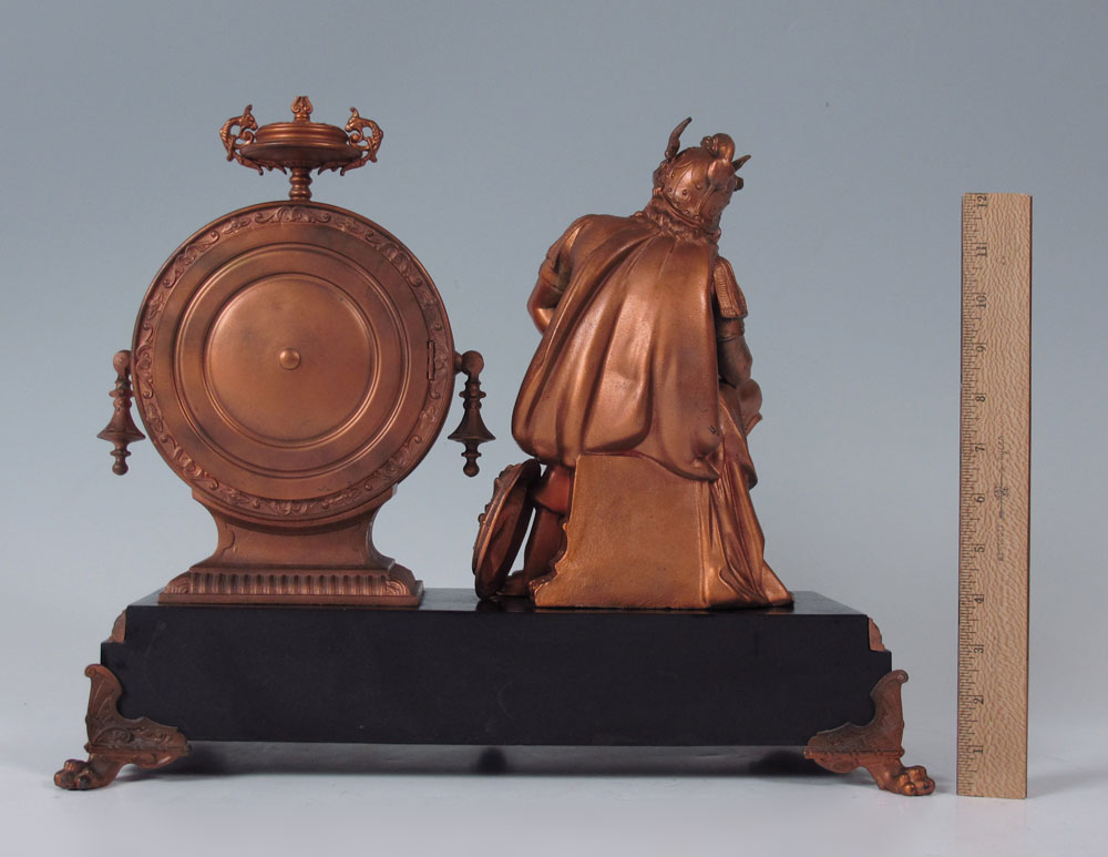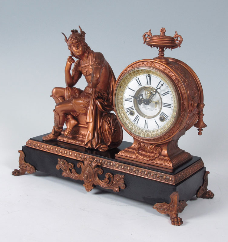 ANSONIA FIGURAL ''MERCURY'' CLOCK: Patinated spelter figure of Mercury seated on cast iron base. Open escapement on porcelain face, marked Ansonia Clock Co. Patented on face. Time only movement marked Ansonia as well. Key and pendulum in office. 14 1/2'' h. x 17 1/2'' x 7 1/2''.