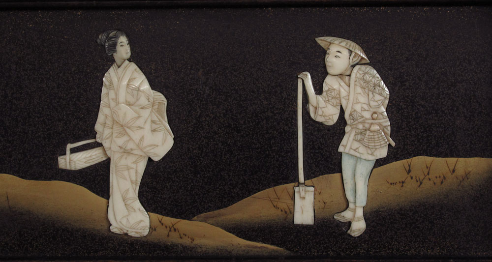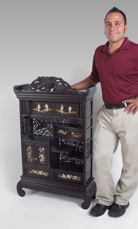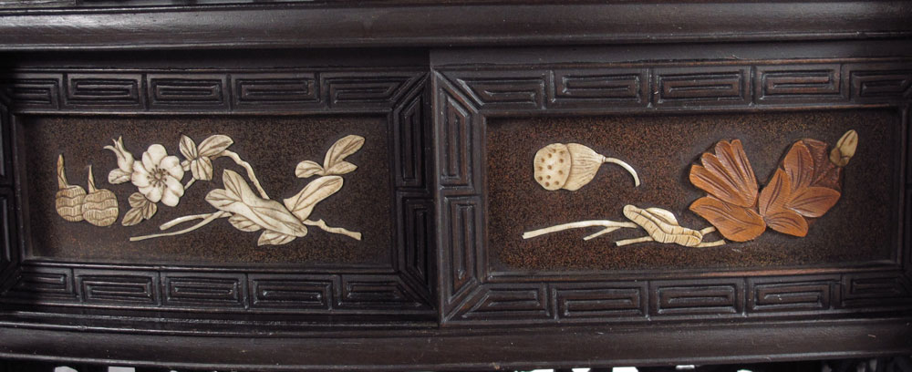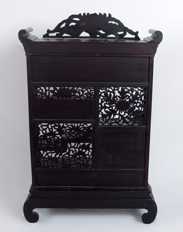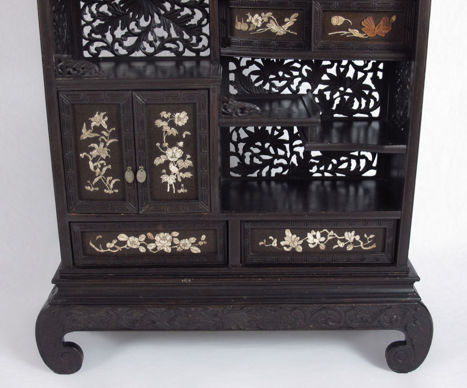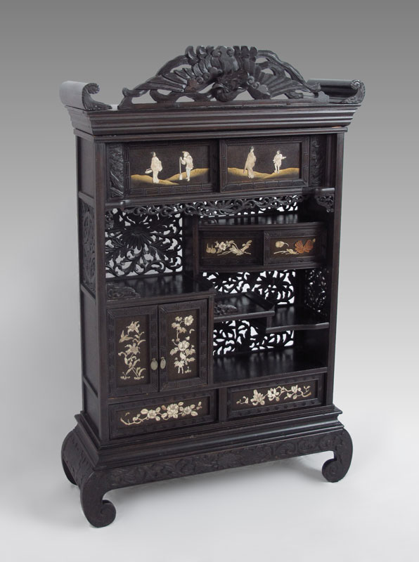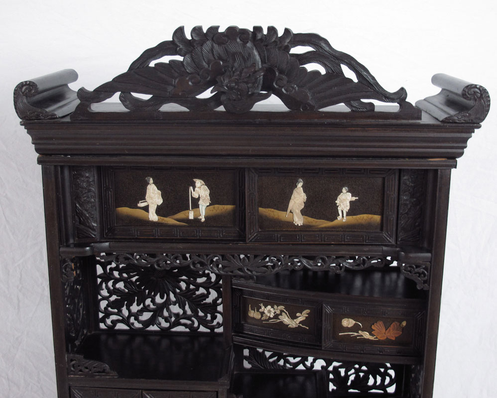 JAPANESE DIMINUTIVE CARVED CABINET: Applied stone figures on a compartmented display cabinet with sliding doors and open display. Approx. 45'' tall x 27 1/2' x 9''.