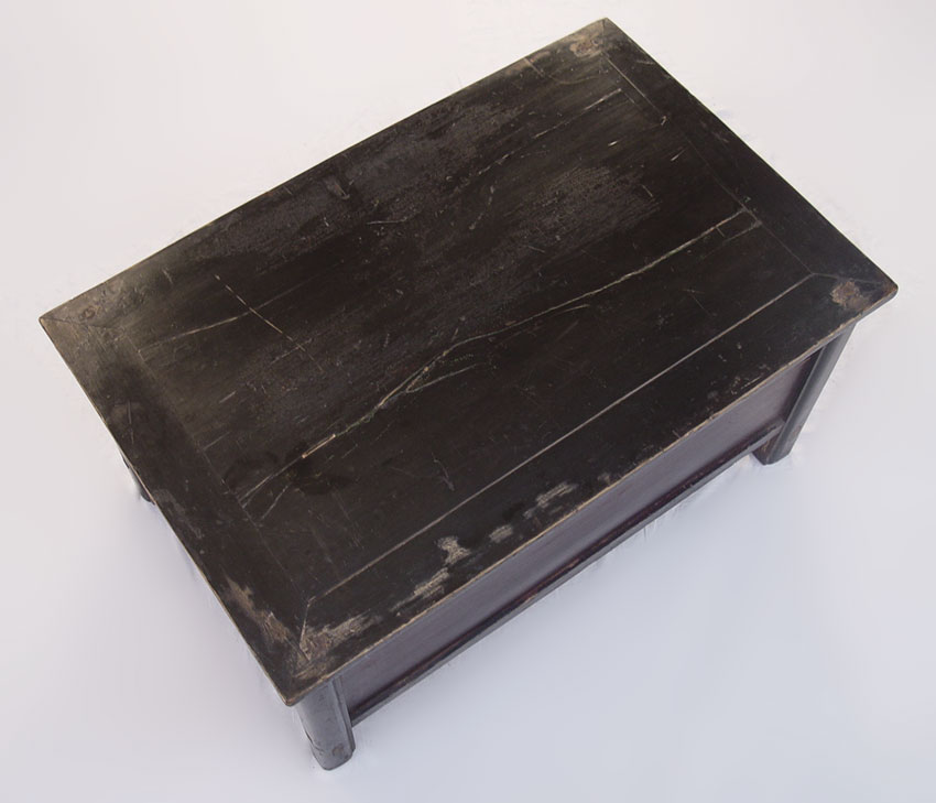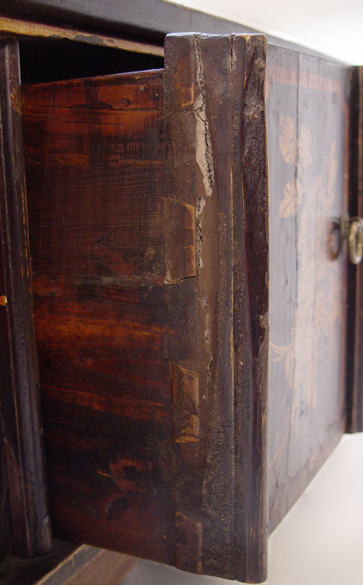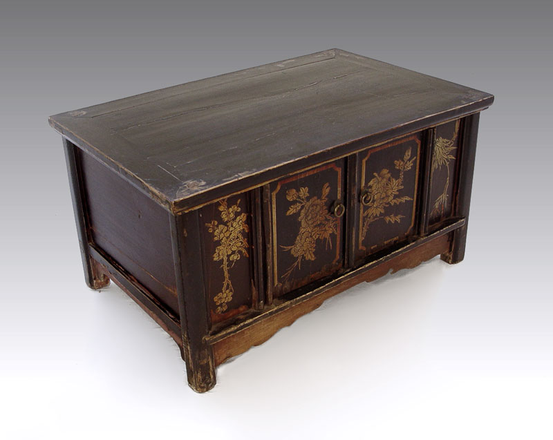 19TH CENTURY CHINESE SHORT CHEST WITH SINGLE DRAWER: Coffee table height, four panel front with gold floral decoration over black ground, through tenon construction, 20 1/2'' h. x 39'' x 25 1/2''.