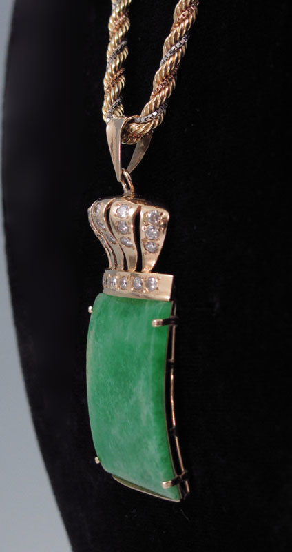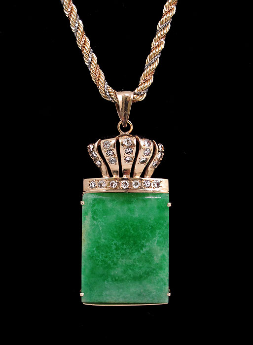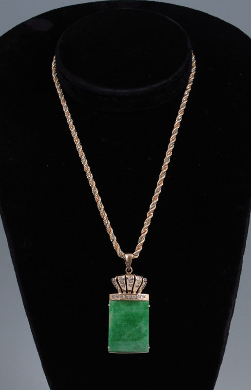 18K GOLD, JADEITE JADE AND DIAMOND PENDANT: 18K yellow gold pendant in a polished pierced crown motif featuring a flat edge arched jadeite jade of medium dark chrome green with light patches throughout. The crown is set with 22 rub over set round full cut diamonds, total weight approx. .66 Ct., rated SI2-I1 in clarity and I-J color. The 18K tri color polished woven chain consists of double yellow gold rope chain wrapped with a white and a rose gold box chain, 15. 1/2''. Lobster claw closure. Chain weighs 5.8 dwt, Pendant 1 3/5'' x 7/8'', weight 7.3 dwt.