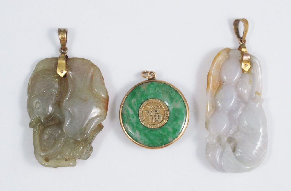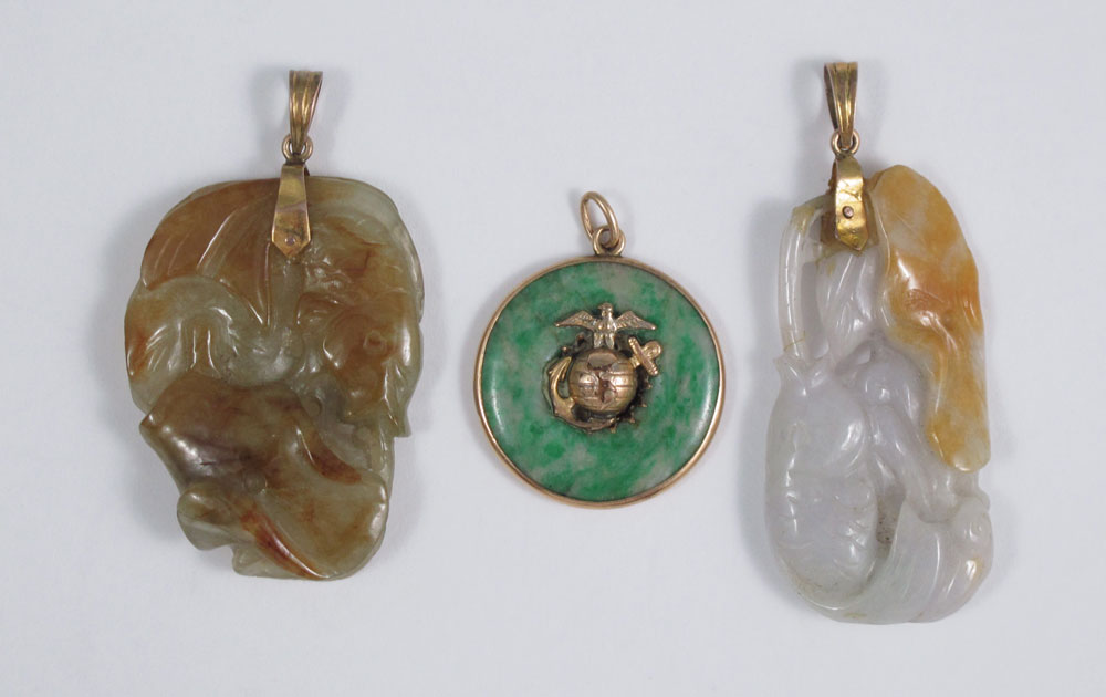3 CARVED JADEITE JADE PENDANTS: 1) FISH carved in gray and brownish yellow jade, 46 x 23 mm. 2) JADEITE JADE DISC PENDANT: Green jade framed in 14k yellow gold centered with base metal U.S. Marine emblem, 1''dia. 3) CARVED JADEITE JADE PENDANT: Fish carved in gray and brown jade, 41 x 3 mm