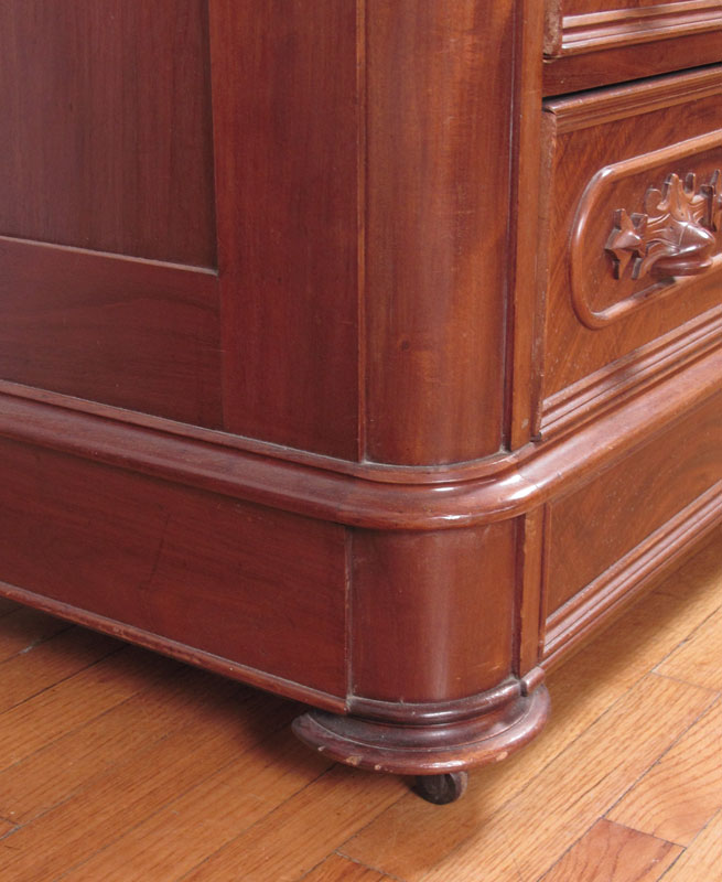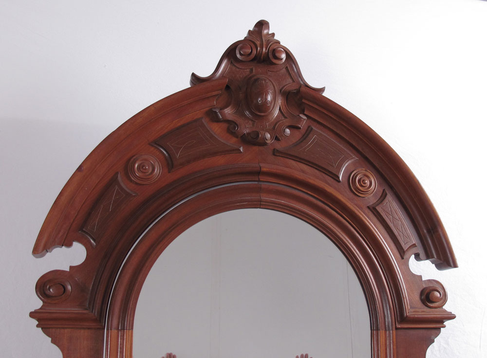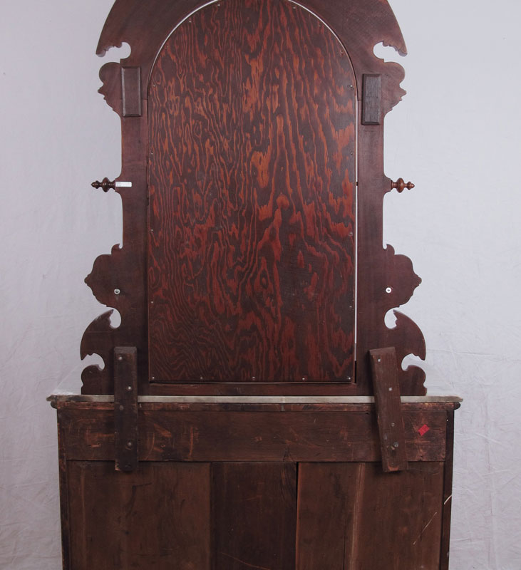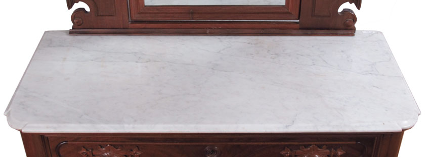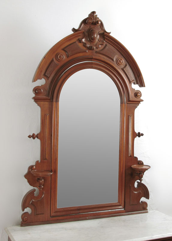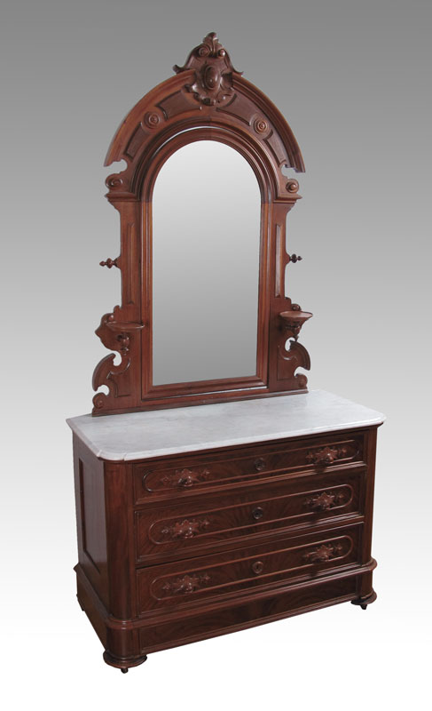 VICTORIAN MARBLE TOP WALNUT DRESSER WITH MIRROR: Classic carved and arched swivel mirror with candle shelves, over white marble top, sold with 2 unattached glove boxes not original to dresser, note finish damage to boxes, 3 drawers with sculpted wood handles. All on castors. Overall 93'' x 48'' x 21 3/4''.