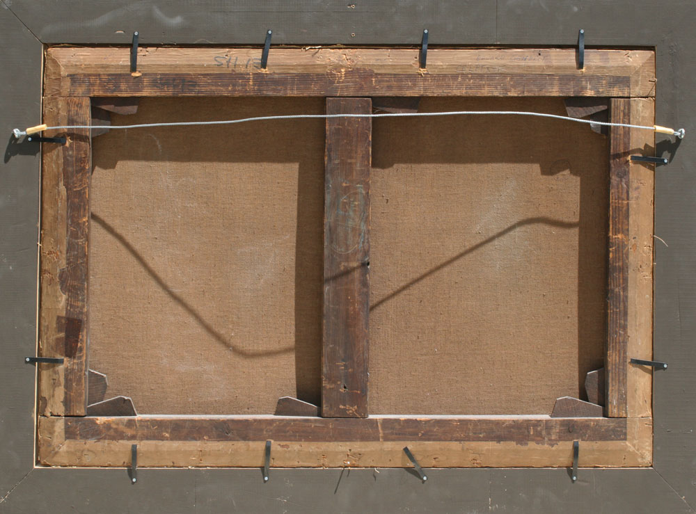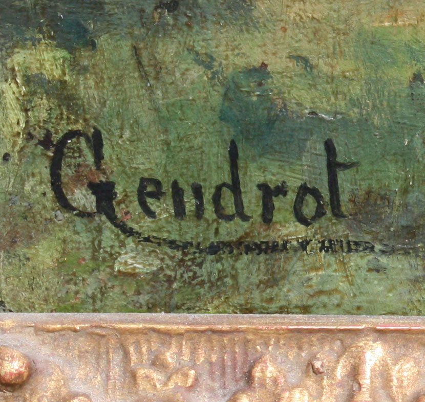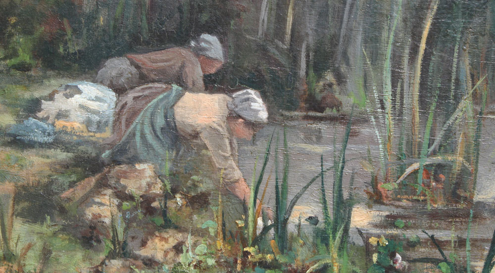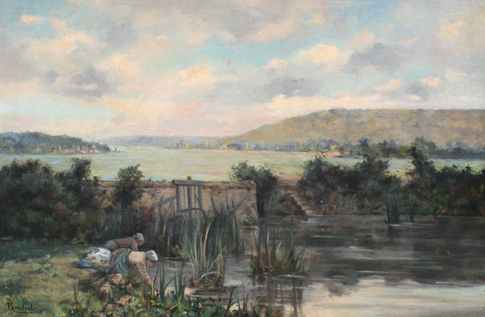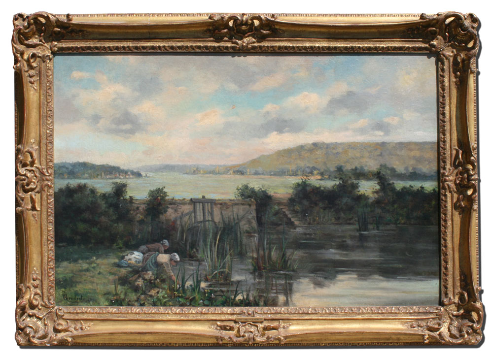 GENDROT, Felix Albert, (American, 1866-): ''Washer Women at the Lakeside'', Oil on Canvas, 21 1/2'' x 32'', signed lower left, encased in elaborate pierce-carved and gilded frame, 27'' x 39''.
