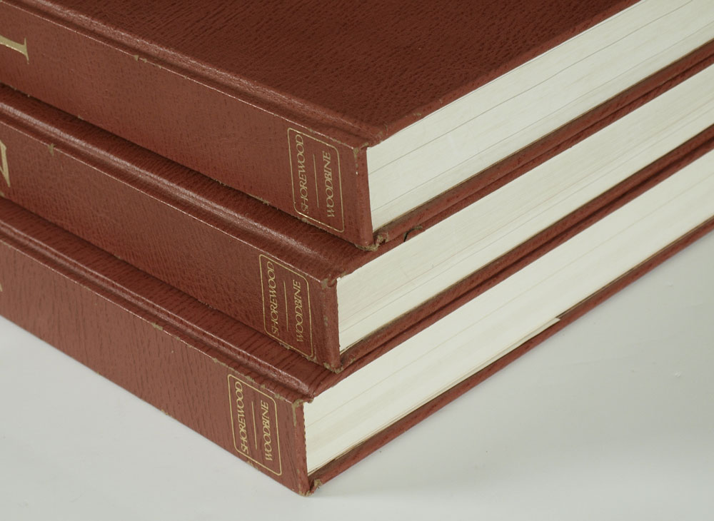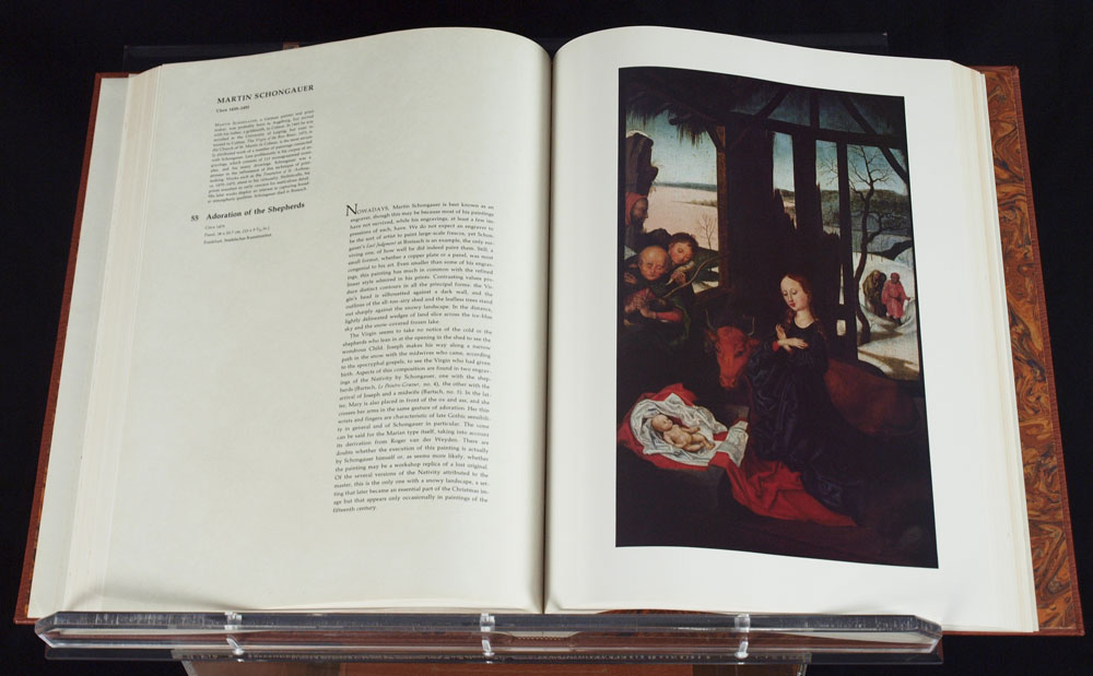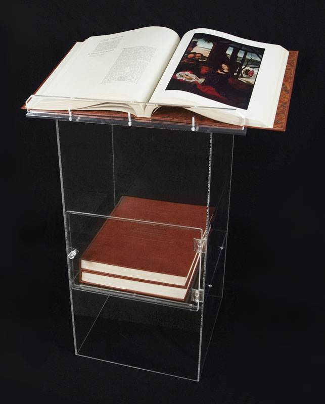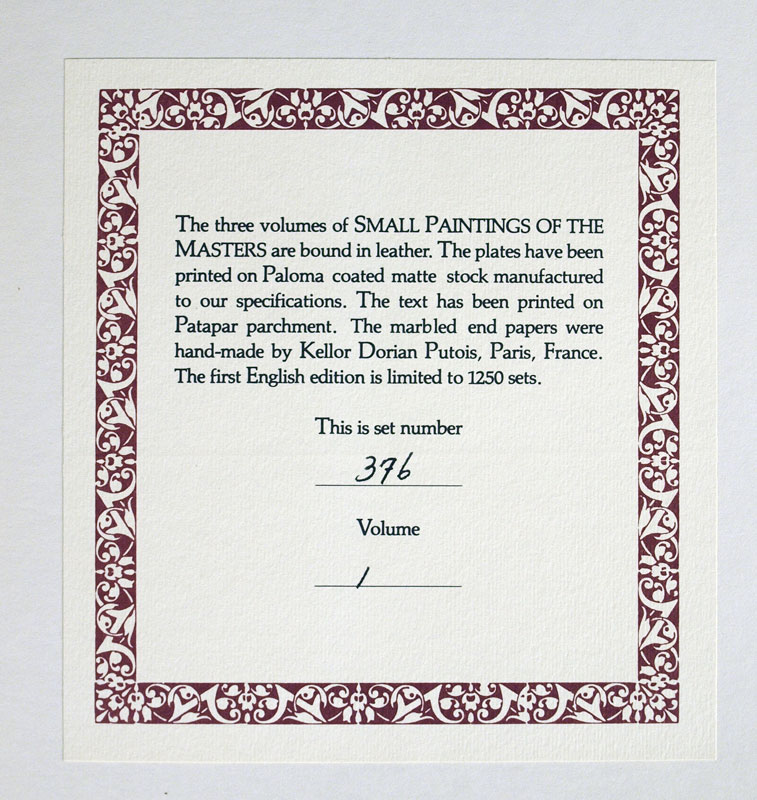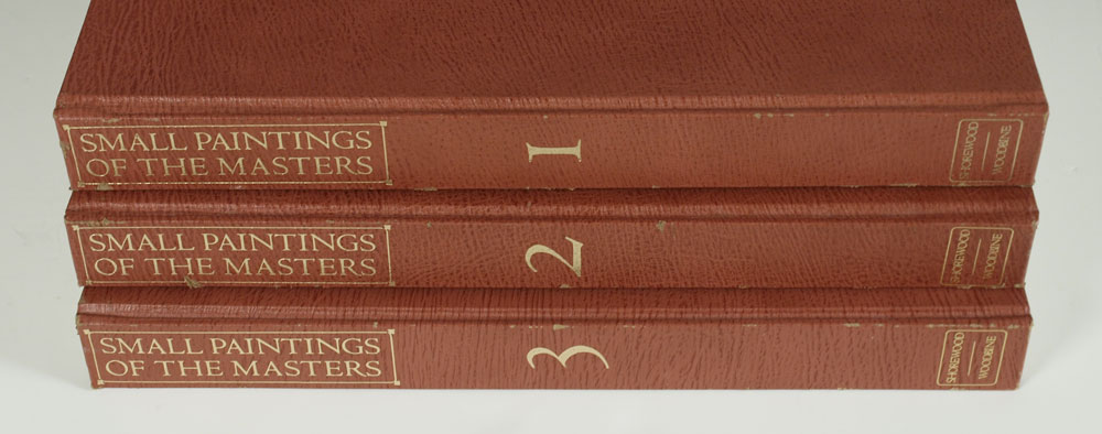 LESLIE SHORE SMALL PAINTINGS OF THE MASTERS BOOKS 1, 2 & 3: Leather bound with floor Lucite stand, custom made with compartment to store books. Set #376 of 1250, plates printed on Paloma paper, text printed on Patapar parchment, information by Egbert Haverkamp-Begerman, edited by Leslie Shore, published by Woodbine 1980. Each book measures 2 1/8'' x 18 3/8'' x 14 1/2''. Stand 41'' h. x 25 1/4'' x 20 1/2''