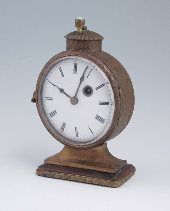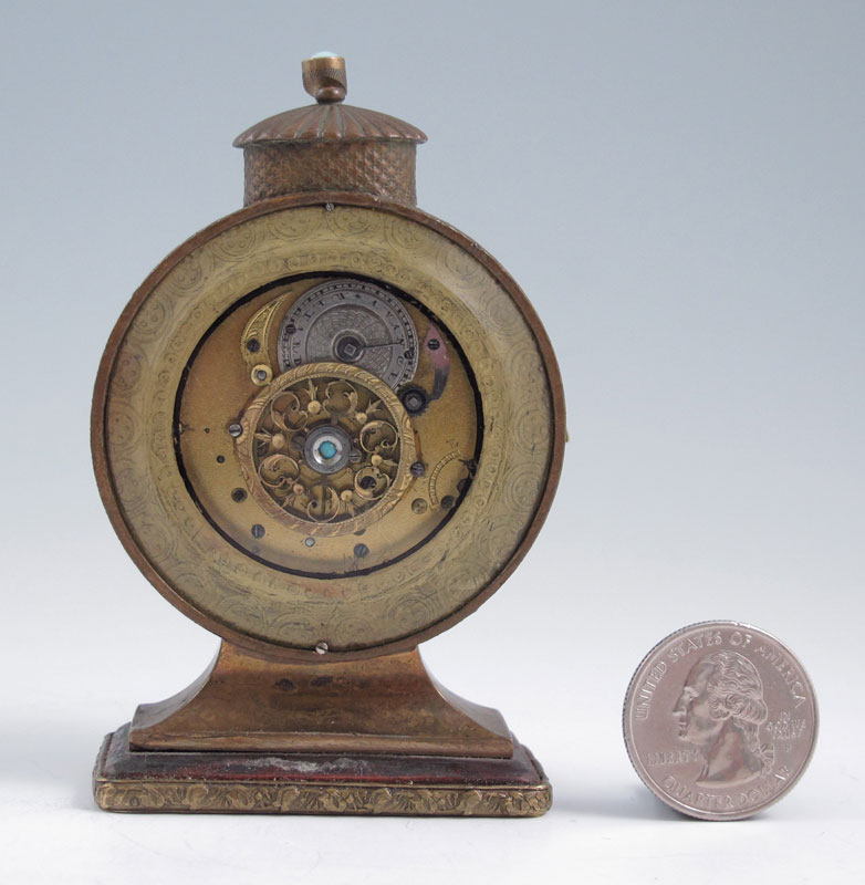 WEESTON 19TH CENTURY MINIATURE BRONZE CLOCK: Bronze case with fish scale design, inset opal on finial. Case marked Weeston near base. Signed key wind French movement with advance and retard opal bob. Key in office. 3 5/8'' h. x 2 3/8'' x 1 /14''.
