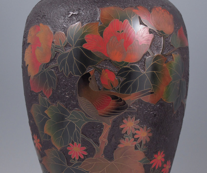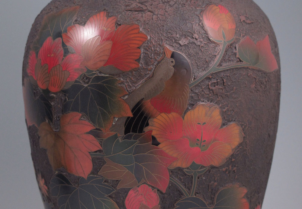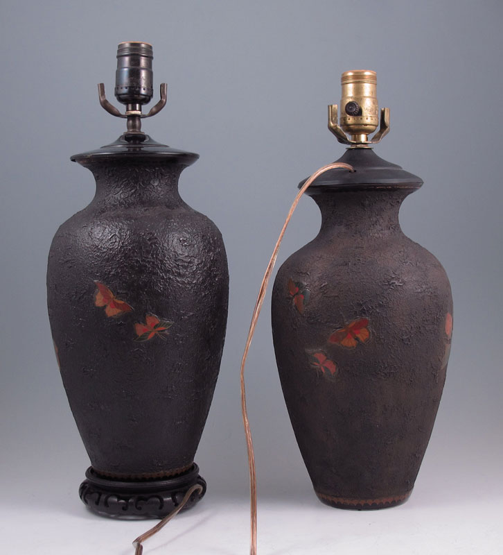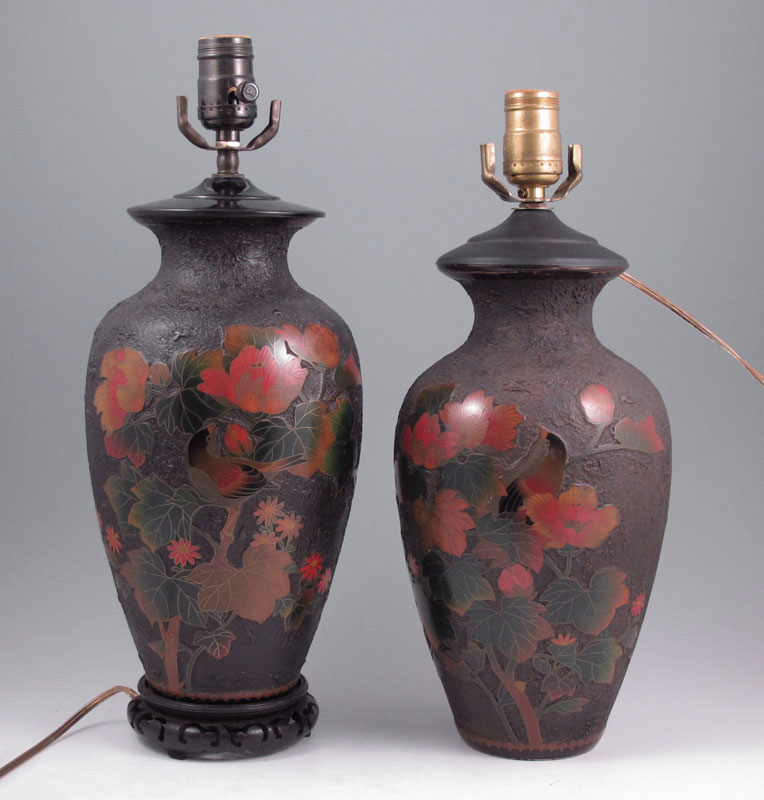 PAIR OF JAPANESE TOTAI CLOISONNE LAMPS: Ceramic body cloisonne with a ''Treebark'' look. Matched pair. Ceramic is 11'' tall.