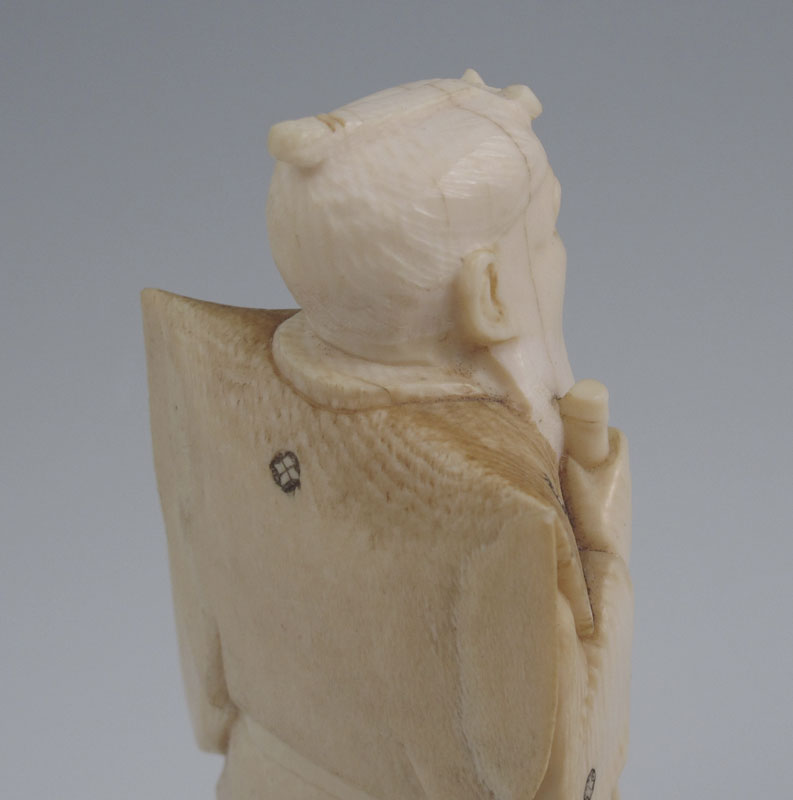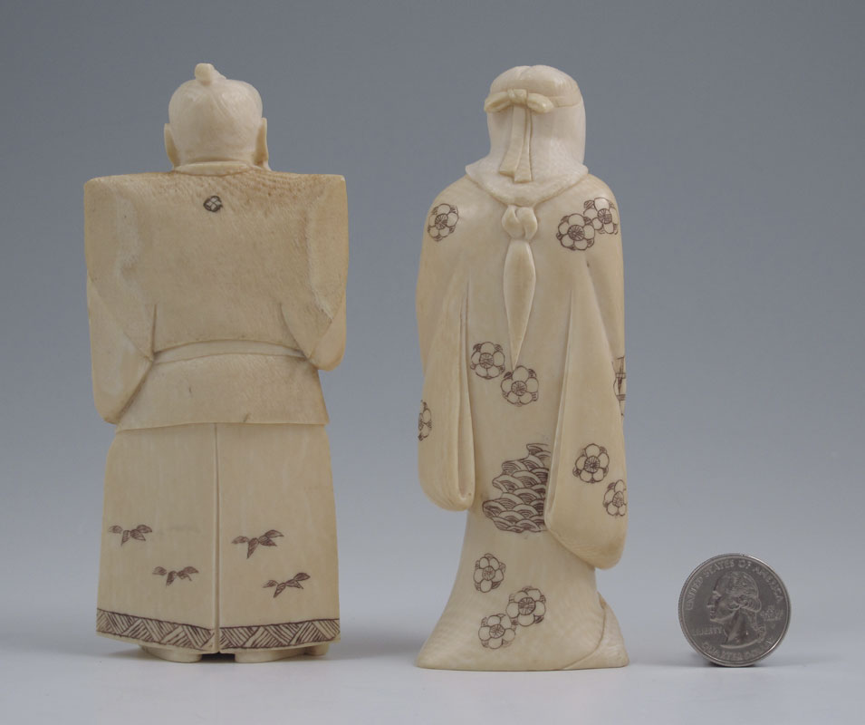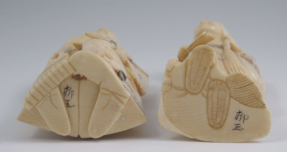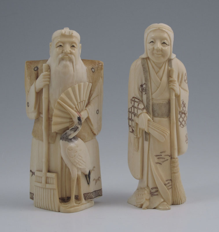 PAIR OF JAPANESE CARVED IVORY FIGURES: To include 1) Man holding broom and fan with polychrome tinted crane in front. Signed in characters on base. 5'' h. x 2 1/4'' x 1 3/8''. 2) Woman holding broom and fan with unfinished turtle at base. Signed in characters on base. 5 1/8'' h. x 1 3/4'' x 1 1/2''.