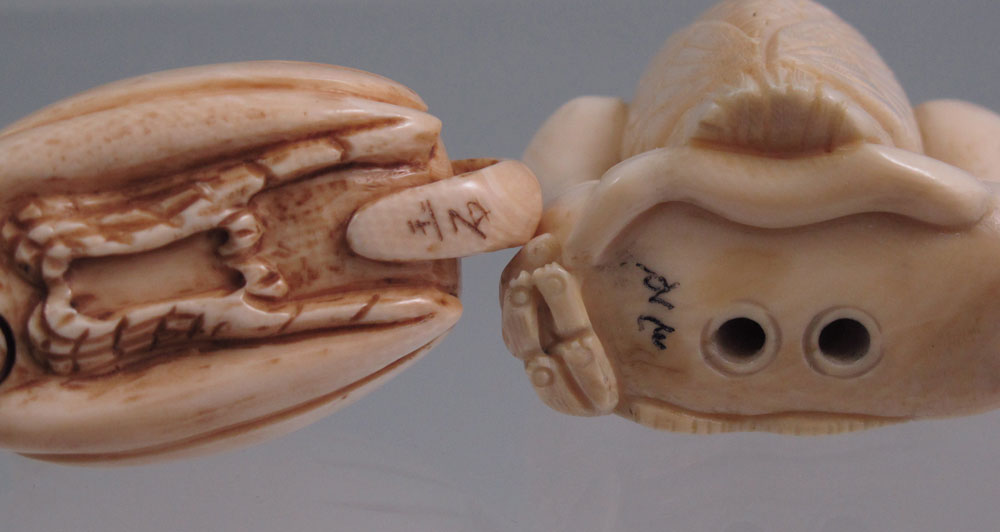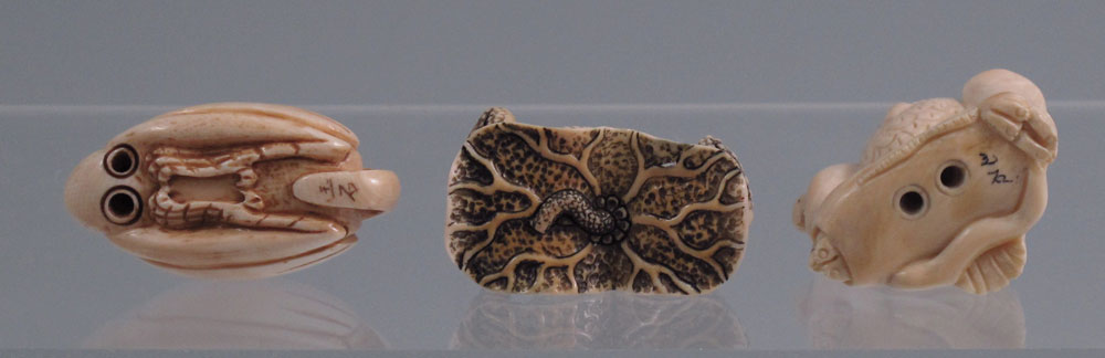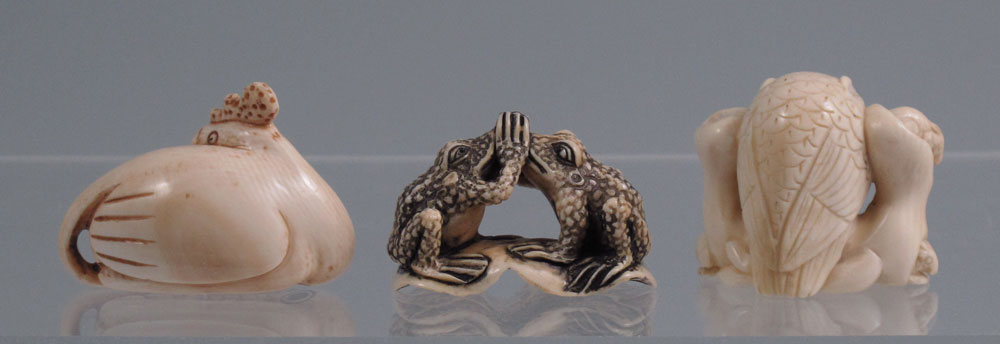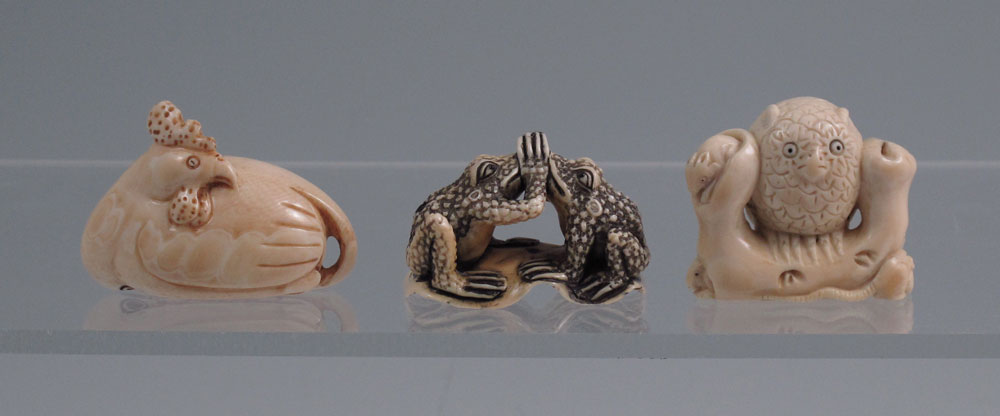3 JAPANESE ANIMAL CARVED IVORY NETSUKE: To include 1) Owl on branch with rats, signed on base, 1 1/2'' h. 2) Rooster, signed on base, 1 3/8'' h. 3) Pair of praying frogs on lilypad, signed on base, 1 1/4'' h.