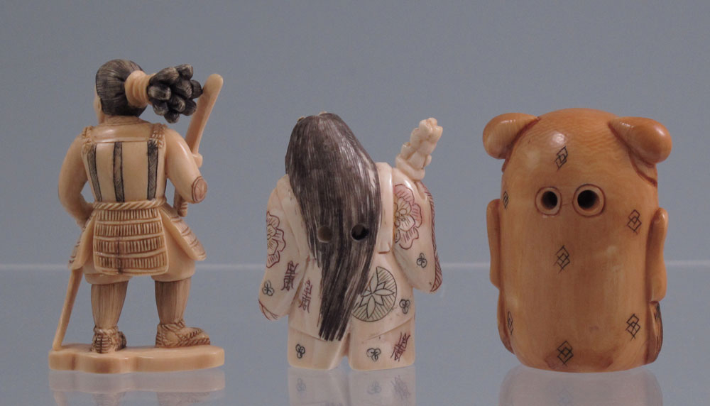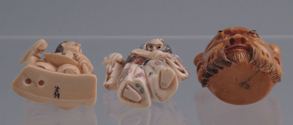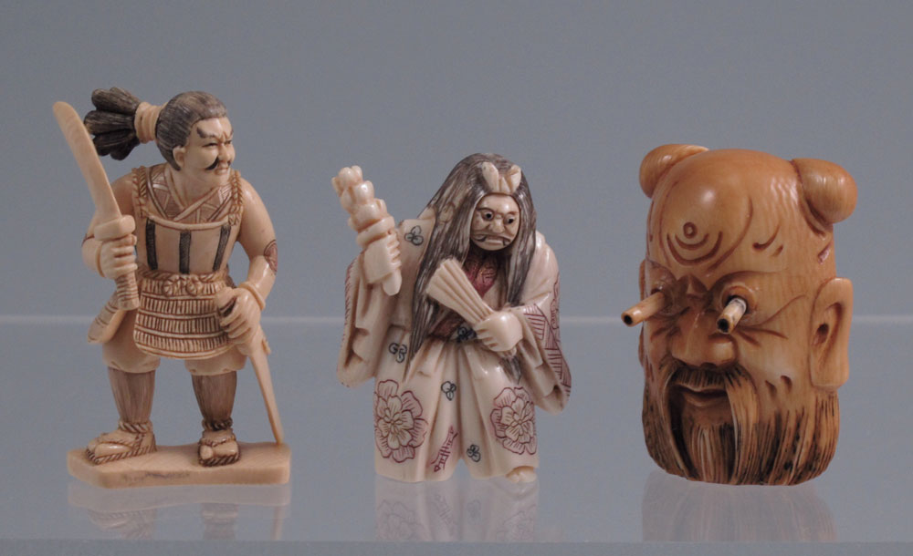 3 JAPANESE FIGURAL CARVED IVORY NETSUKE: To include 1) Wise man with extendable eyes, signed on base, 2'' h. 2) Warrior with sword, signed on base, 2 3/8'' h. 3) Priest with articulated face, signed on base, 2'' h.