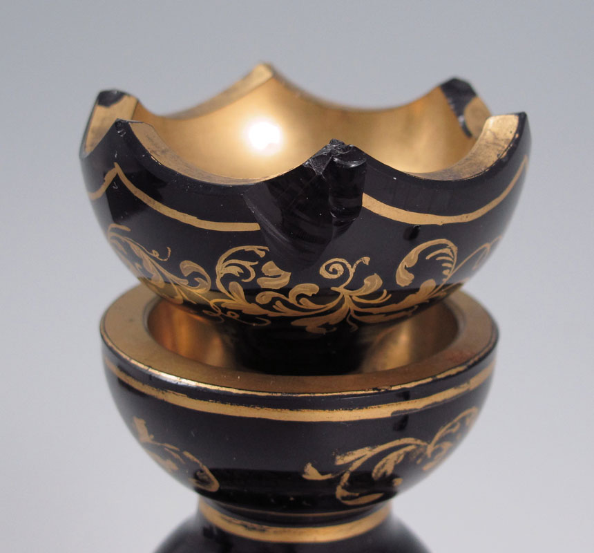 COUNT BUQUOY GLASSWORKS BOHEMIAN BLACK HYALITH PERFUME BOTTLE: Ca. 1820-1840. With stopper, gilt decorated black glass, 4 7/8'' tall.