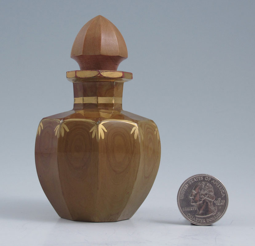 FRIEDRICH EGARMANN HYALITH GLASS PERFUME BOTTLE: Woodgrain effect glass with wood stopper, 4''.