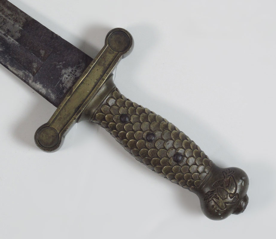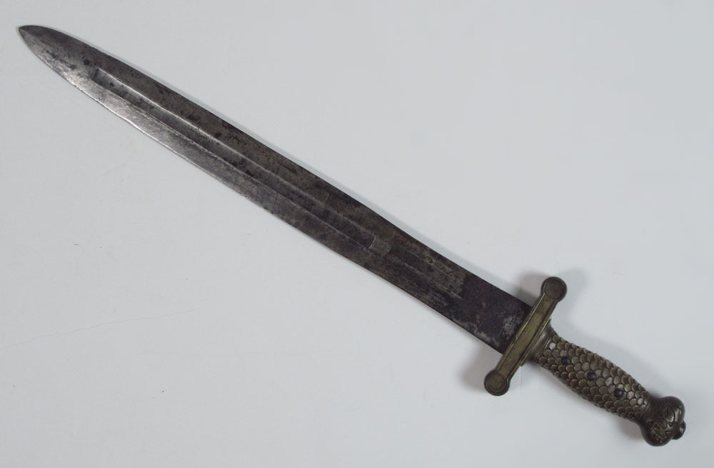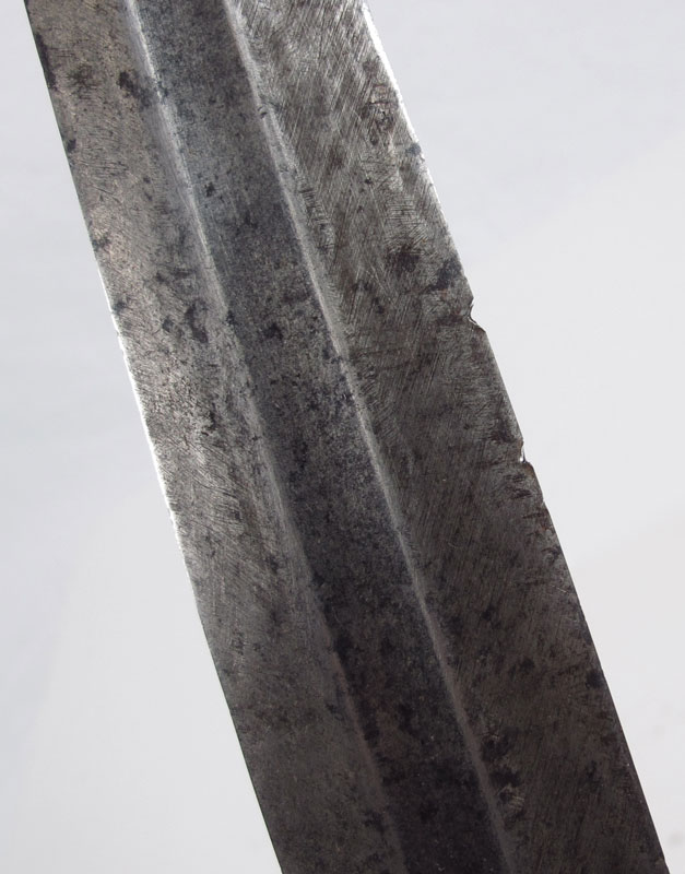 CONDITION: Note chips, areas of surface rust, pitting and roughness to blade. Nicks to crossguard.