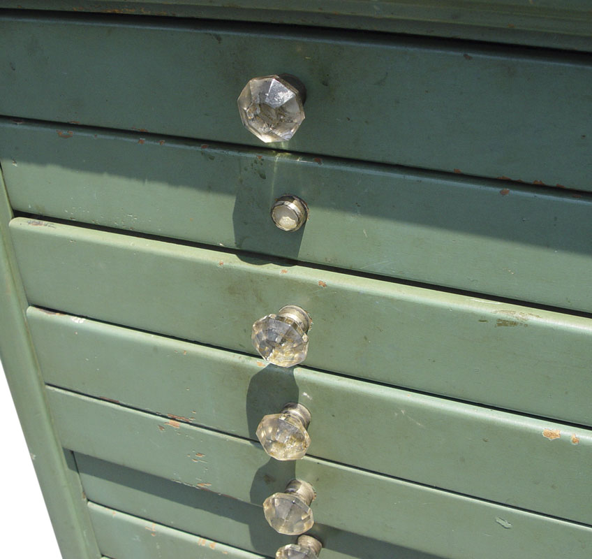 GREEN PAINTED DENTAL CABINET: 2 glass doors over 10 full length metal and 6 graduated half-length drawers with metal interior. Mirrored backsplash. 61 1/4'' h. x 30 3/4'' x 13''.