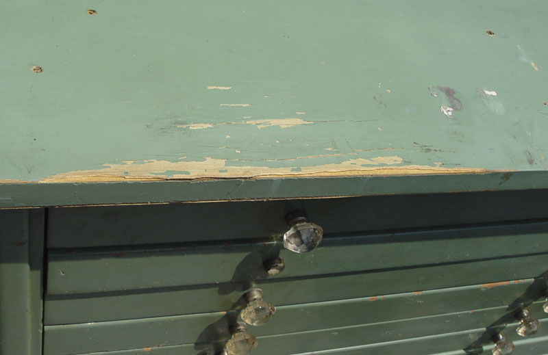 CONDITION: Note missing knob, paint loss and bubbling to wood. In need of conservation.