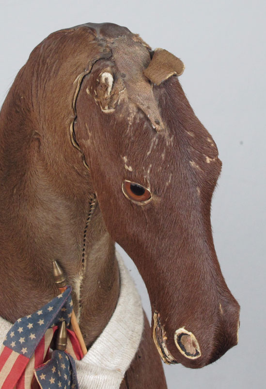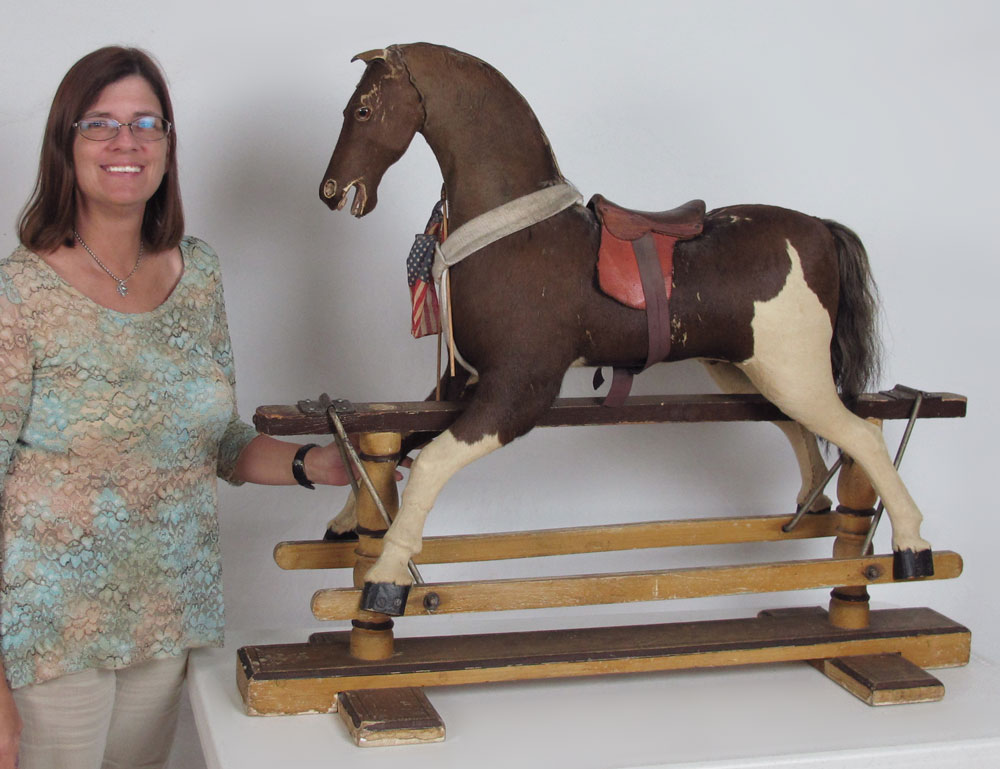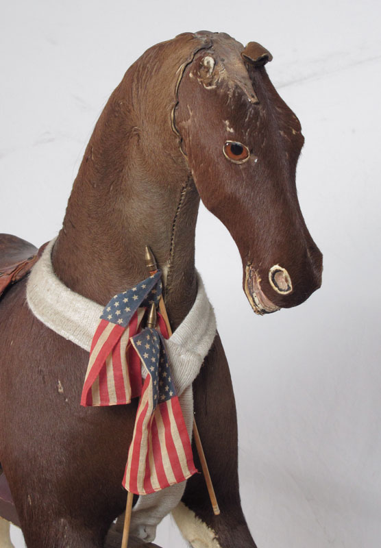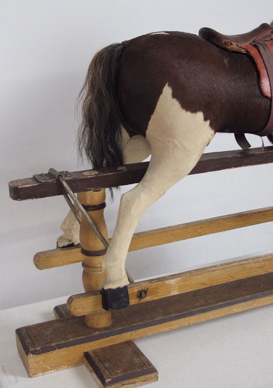 EARLY 20TH CENTURY CHILDS GLIDER / ROCKING HORSE: Circa 1900-1910, Stuffed childs glider horse, with horse hide body and leather saddle. Original painted wood frame. 36'' h x 43 1/2'' x 14''.