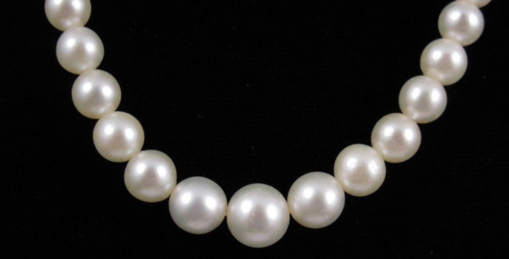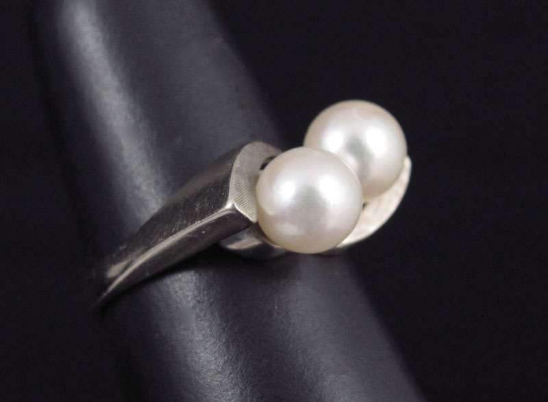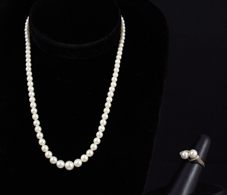 CULTURED PEARL NECKLACE AND 14K GOLD & PEARL RING: 1) 14K white gold ring with two 7.00 mm cultured pearls. One pearl is peeling. Size: 7 Weight: 6.5 grams. 2) A 4.00-7.00 mm strand of graduated cultured pearls. Cream in color, slightly blemished with medium luster. Sterling silver clasp.