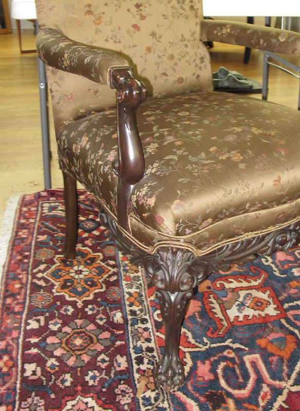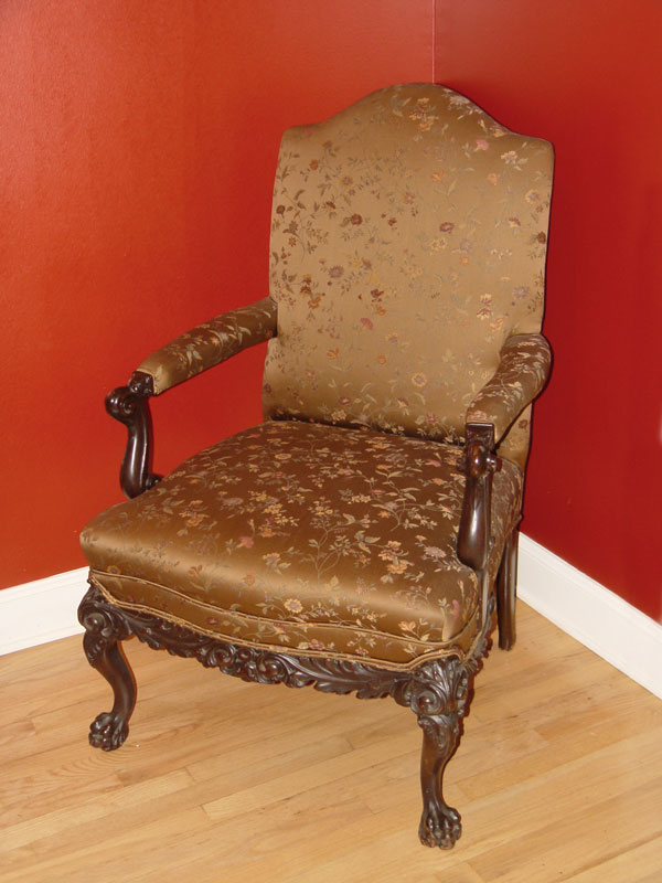 VICTORIAN CARVED AND UPHOLSTERED ARM CHAIR: High back upholstered seat and arms in a floral brocade fabric on a bronze colored ground. Carved rolled arm support, carved apron and cabriole leg and paw feet. 44'' h. x 28 1/2'' x 30 1/2''