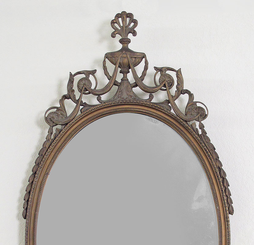 CARVED WOOD HALL MIRROR: Carved and painted wood frame with urn final and floral garland. 51 3/4'' x 26 3/4''.