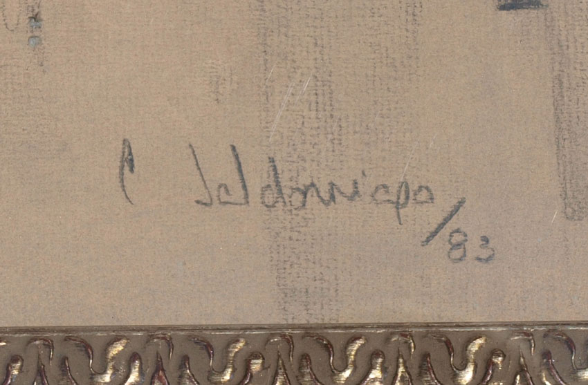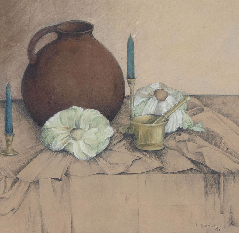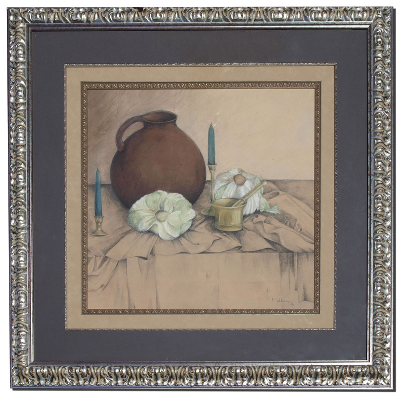 SALDARRIAGA, Maria, (American, 1954-): Still Life with Handled Jug, Candles, and Mortar and Pestle, Graphite and Pastel, sight size 26'' x 27 1/2'', signed lower right and dated '83, craved and gilded wooden frame, 46'' x 48''.
