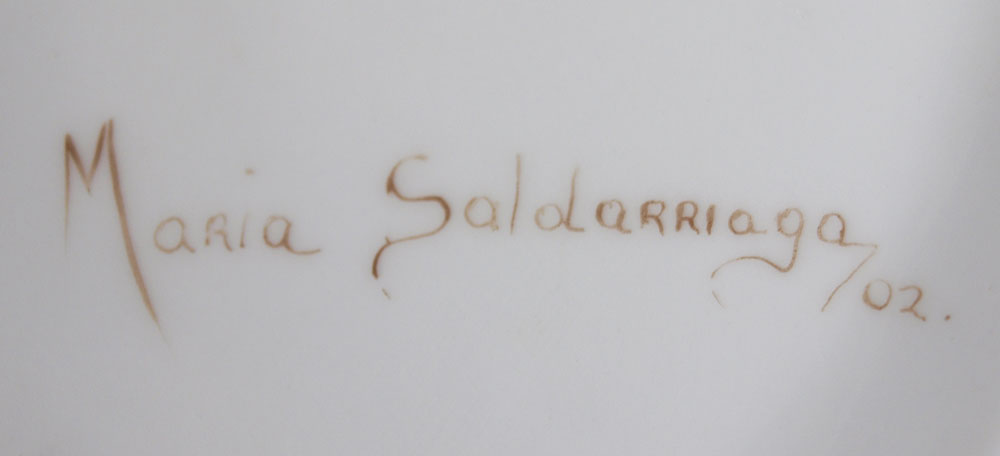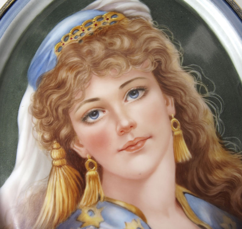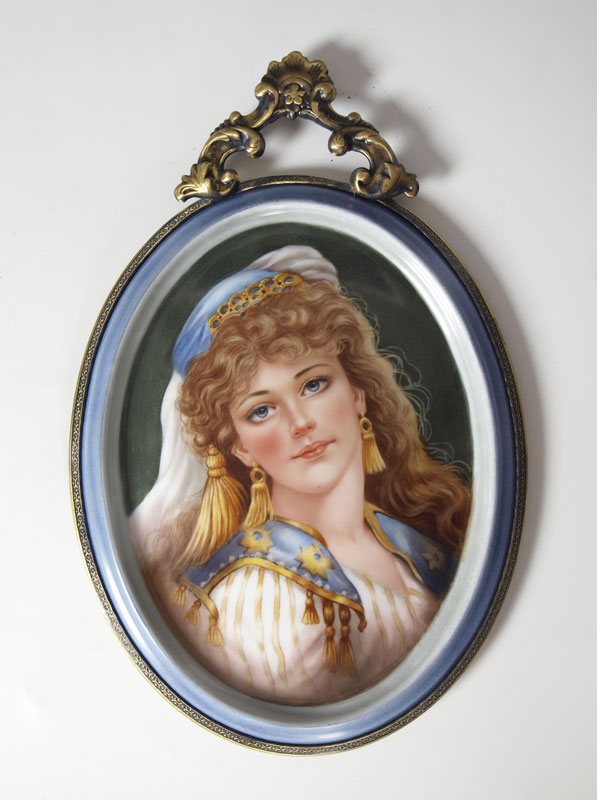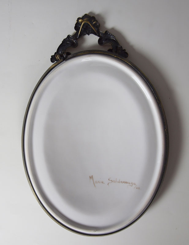 SALDARRIAGA, Maria, (American 20th C): Young Maiden Portrait in Royal Festive Costume, Painting on Oval Porcelain, 7 1/2'' x 5 3/4'', signed Maria Saldarriaga, dated 02 verso, encased in metal frame, 9 1/2'' x 6 1/2''.