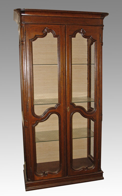 COUNTRY FRENCH MESH FRONT CABINET: Two door display cabinet with wire mesh sides and doors, 3 glass shelves, 81''h. x 42'' x 21''.