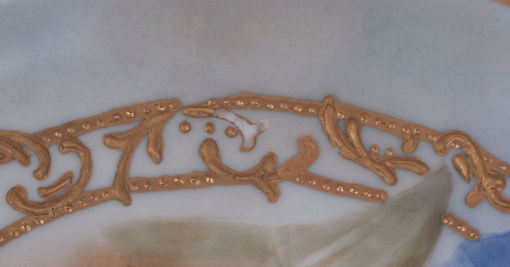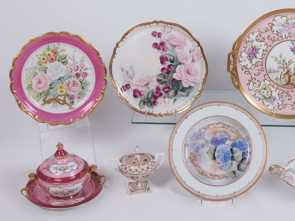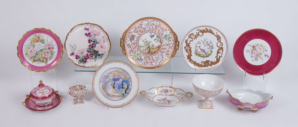 SALDARRIAGA, Maria, (American 20th C): 12 piece fine hand painted china to include large charges, fruit bowl, compote, covered sugar, serving bowl with underplate. Limoges, Bavarian, German, china hand painted by Maria Saldarriaga.