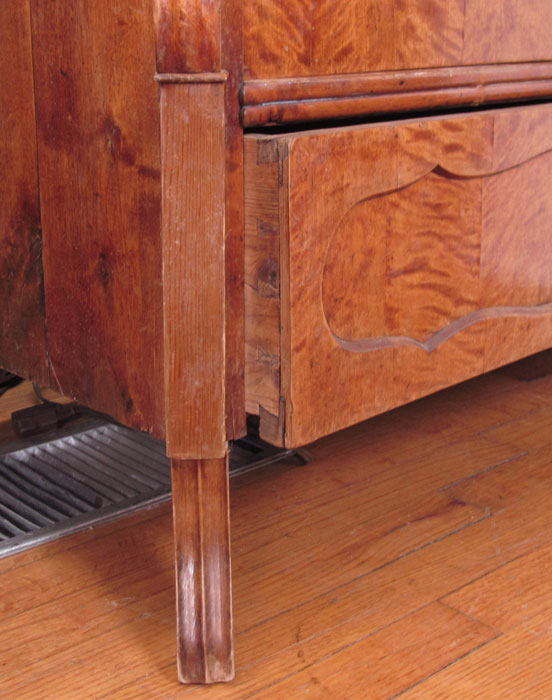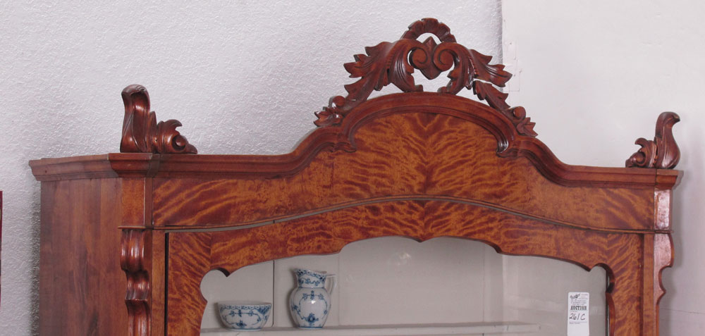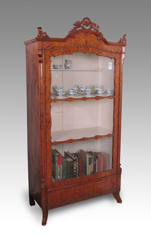 LATE VICTORIAN SATINWOOD GLASS DOOR DISPLAY CABINET VITRINE: Three interior shelves, 3 panel glass door with decorative trim and cut crest. 78'' h. x 39 1/2'' x 19''.