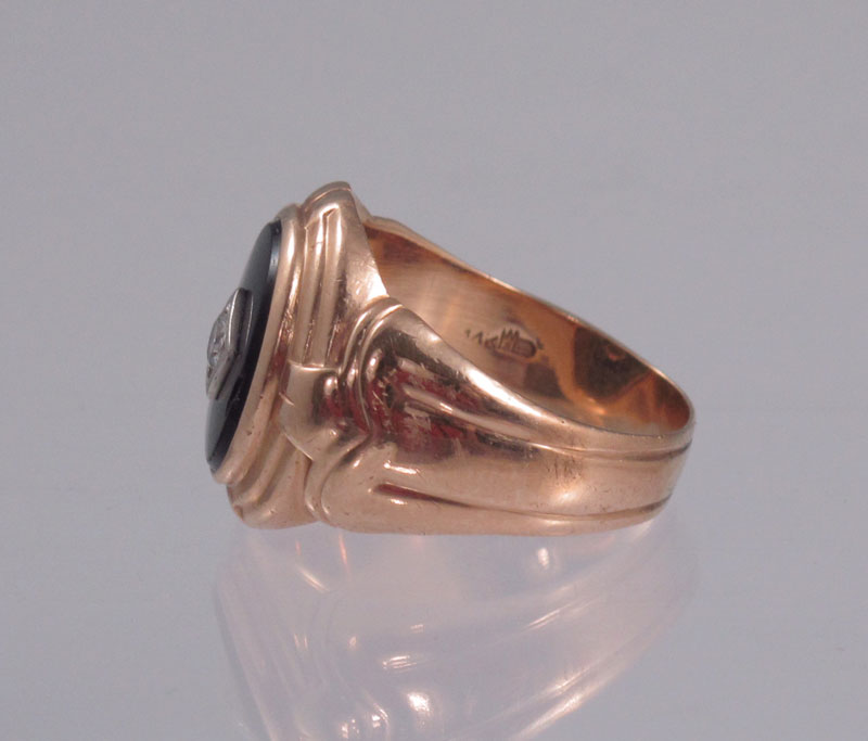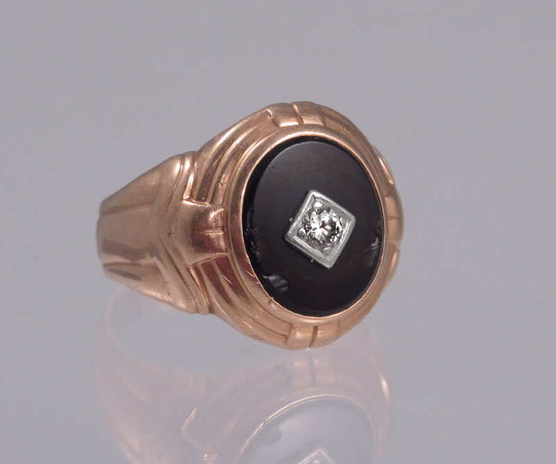 14K GOLD MAN'S ONYX & DIAMOND RING: 14K yellow gold ring contains one round brilliant cut diamond. Weight: .15 Ct. Approx. Rated VS1 in clarity and G in color. The diamond is prong set. Oval black onyx tablet (chipped). Weight: 12.4 grams Size: 10