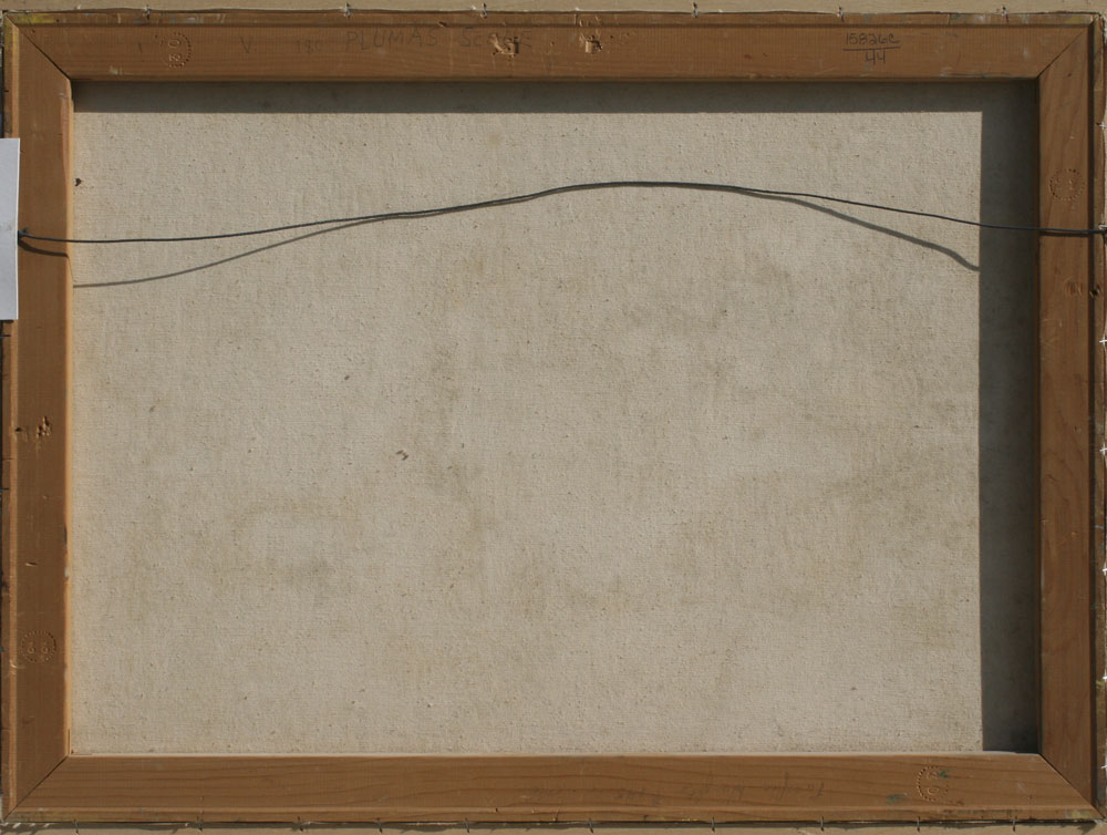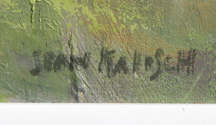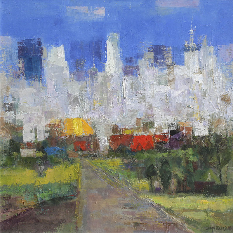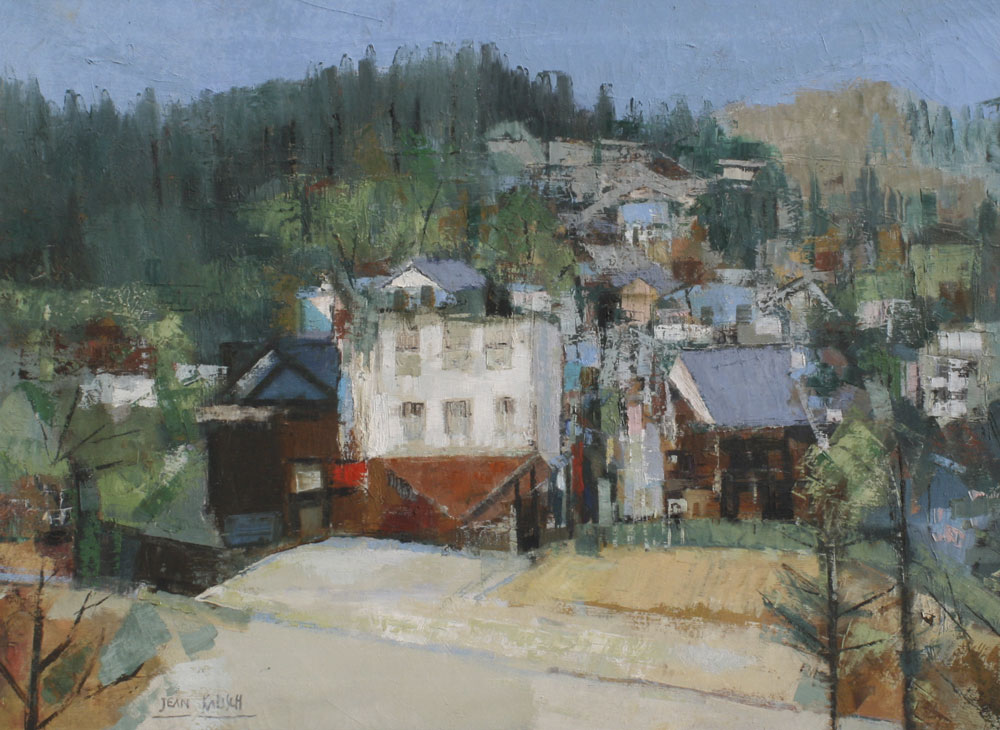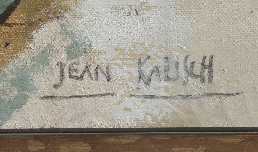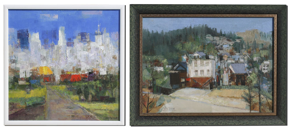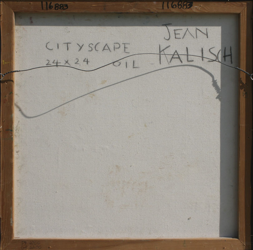 KALISCH, Jean, (American, 20th C.): 1) ''Cityscape'', Oil/Canvas, 24'' x 24'', signed lower right, lacquered white frame, 25 1/2'' x 25 1/2'', signed verso and titled; 2) ''Plumas Scene'', Oil/Canvas, 22'' x 30'', signed lower left, custom painted frame, 27'' x 35'', title on the stretcher verso.