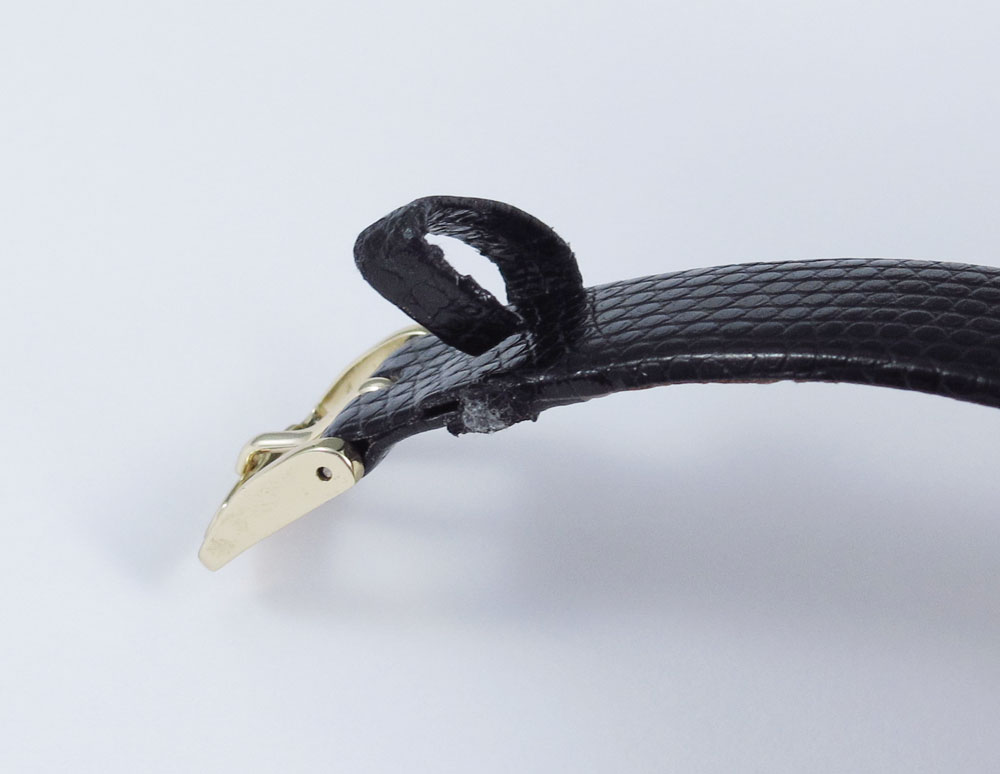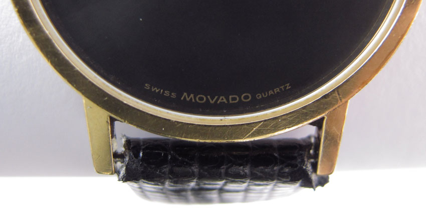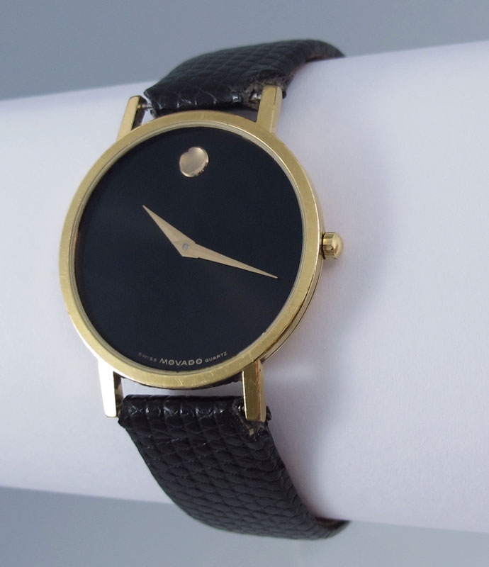 MOVADO MUSEUM WRISTWATCH: Gold plated top with stainless steel back. High grade Swiss quartz movement in running order. Water resistant lizard grain strap, needs new strap keeper, 9''.