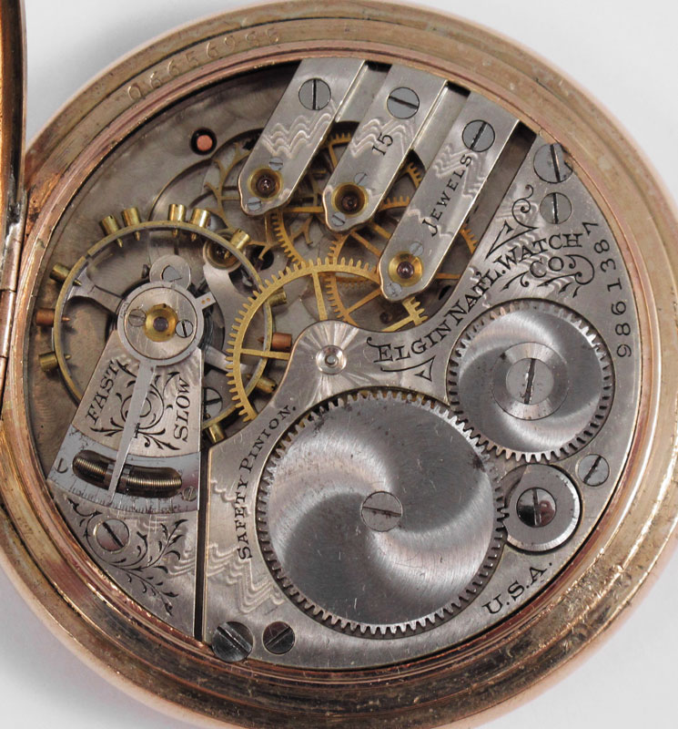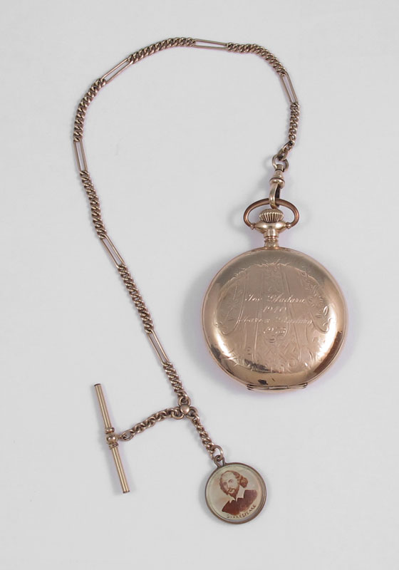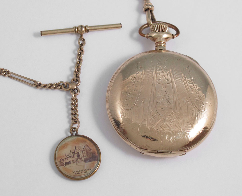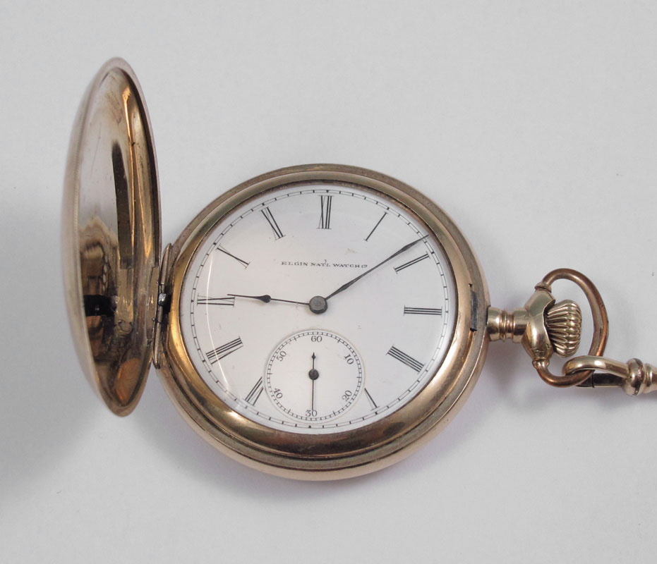 SIZE 16 ELGIN HUNTERS CASE POCKET WATCH AND CHAIN: Ca. 1902. Inscriptions dated 1940 and 1973 on the gold filled case. 15 jewel movement in running order, lid and leaf springs close nicely.