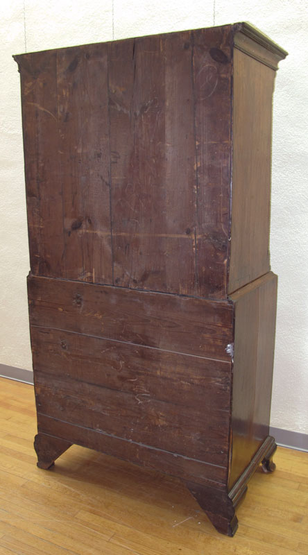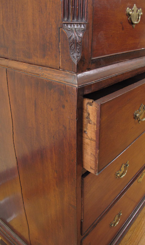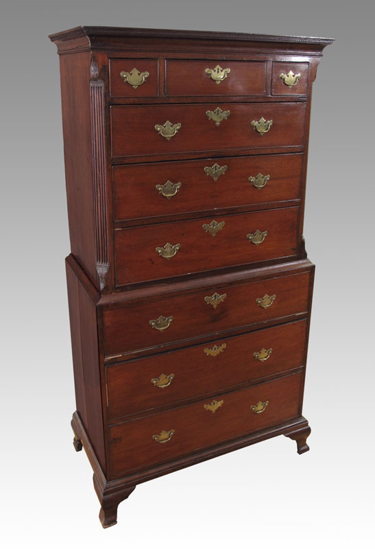 CA. 1770's ENGLISH TALL BOY CHEST ON CHEST: Molded cornice over 9 drawers, reeded stiles, original brass pulls, approx. 76'' x 39'' x 22''.