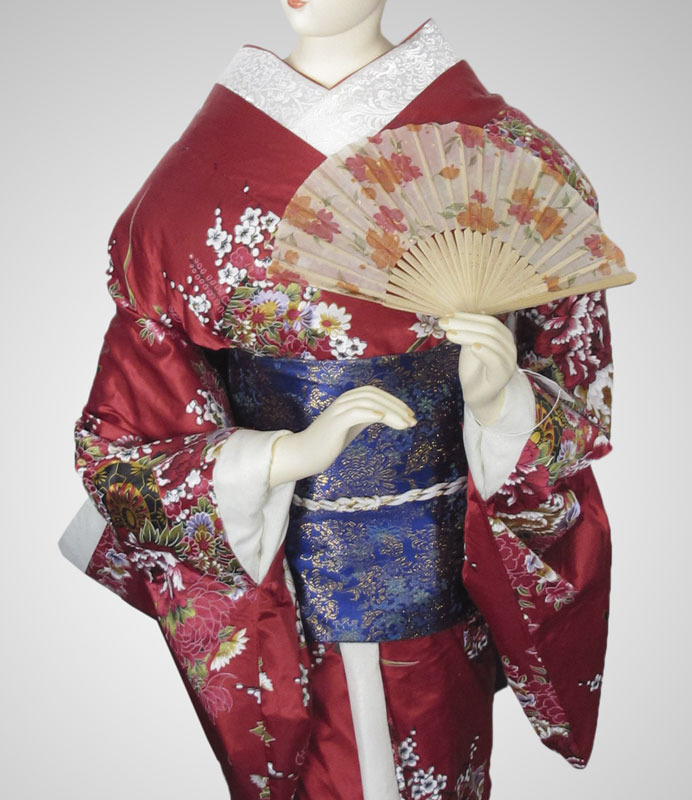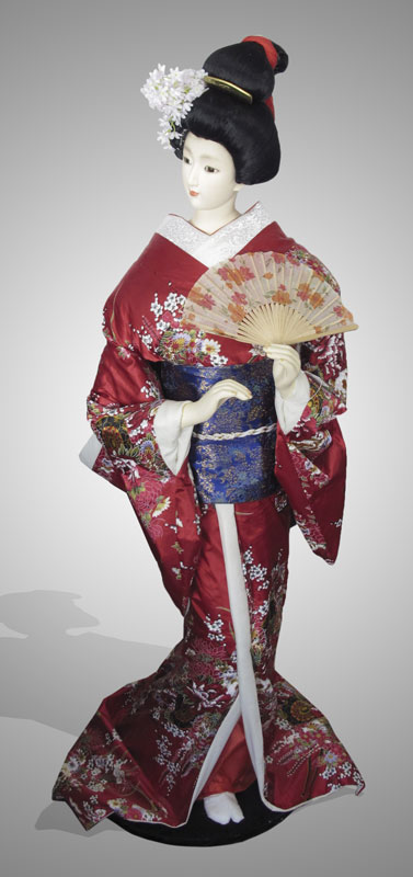 GEISHA MANNEQUIN WITH KIMONO: 61 1/2'' h. x 20'' x 18'' on stand.